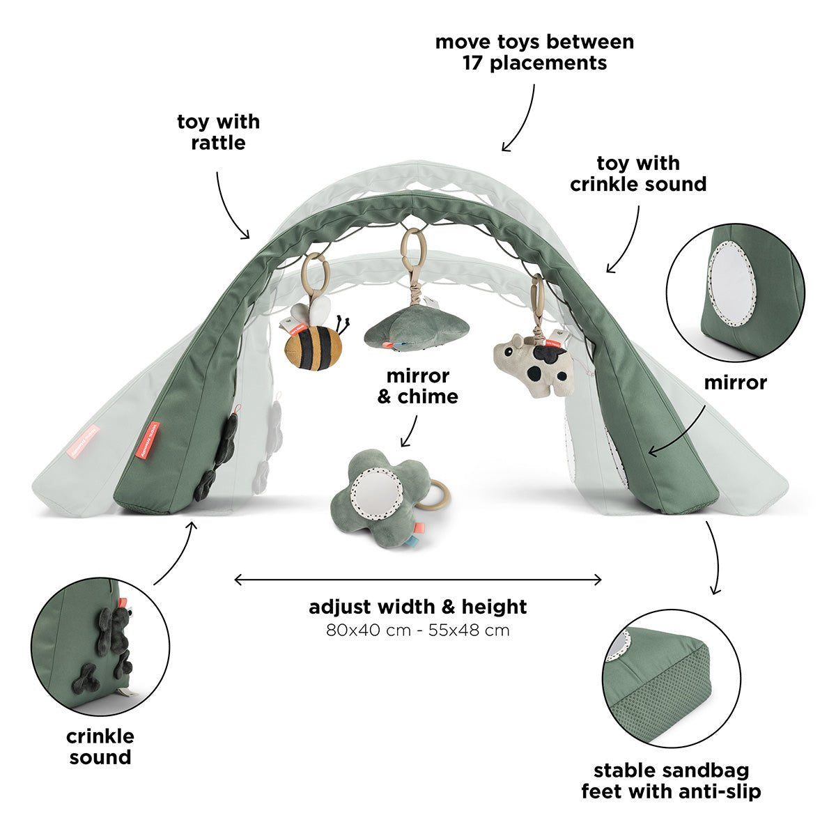 Deze zachte en uitnodigende activiteitengym stimuleert de ontwikkeling en nieuwsgierigheid van je kleintje. De verstelbare, vrijstaande boog is eenvoudig te plaatsen boven een speelmat, wieg of box. De drie meegeleverde speeltjes hebben verschillende texturen, geluiden en een spiegeltje om de zintuigen te prikkelen en de eerste motorische vaardigheden te ondersteunen.