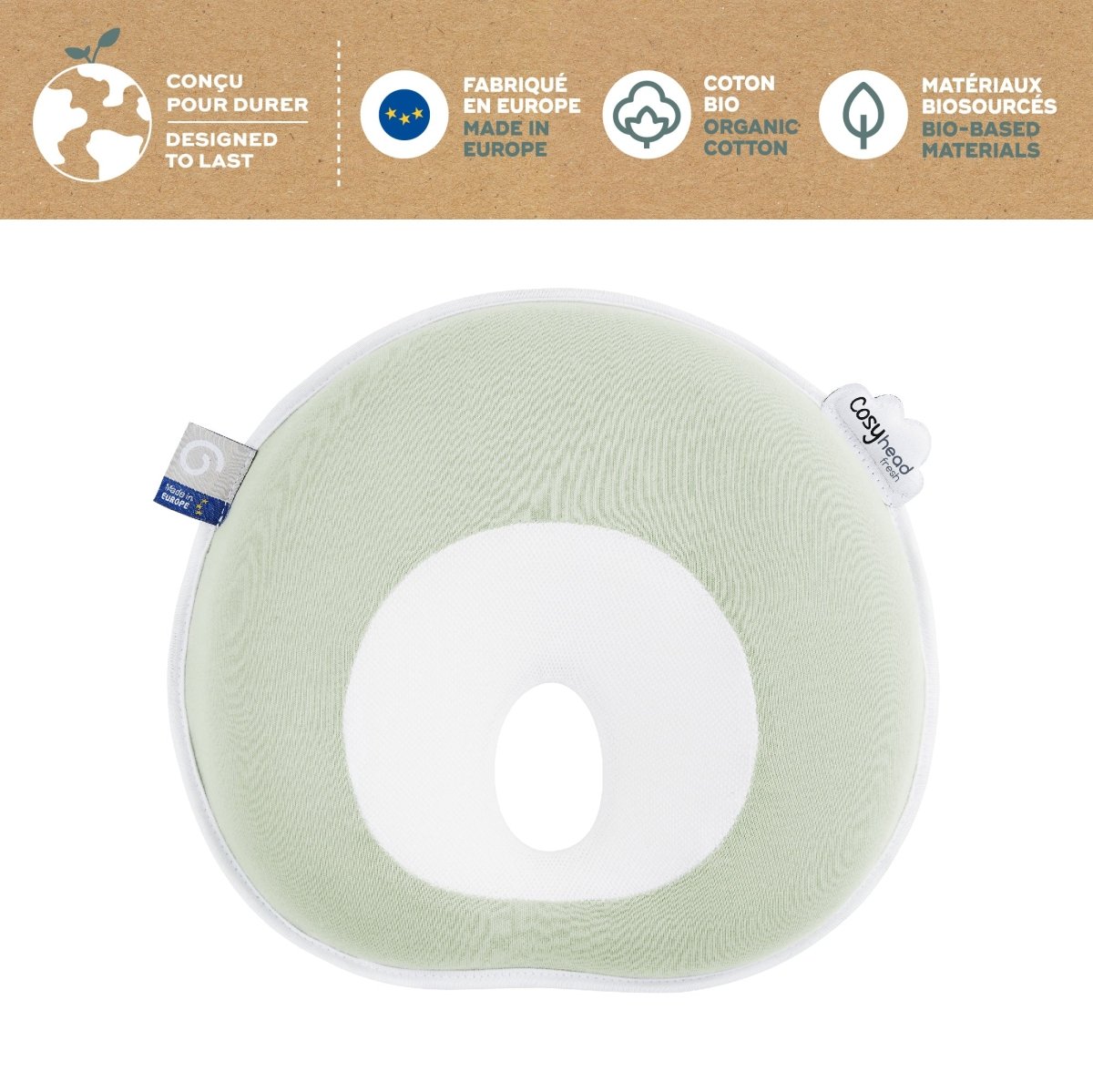Dit kussen, gemaakt in Europa, biedt uw baby een gezonde en comfortabele ondersteuning voor een goede ontwikkeling.