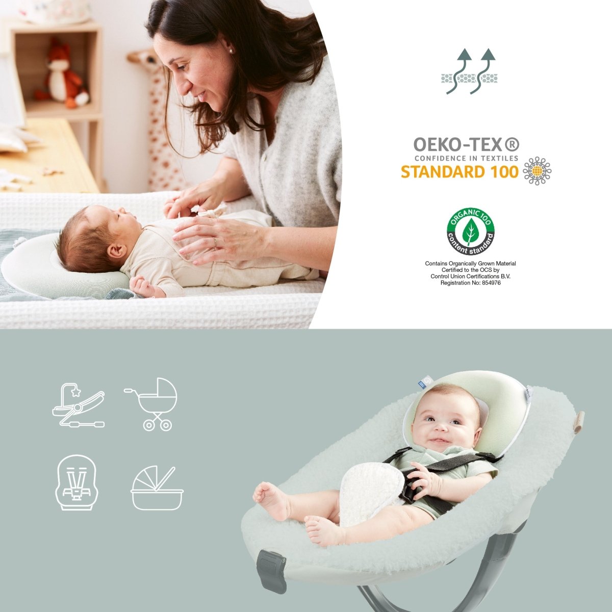 De Cosyhead Fresh is gemaakt van Lyocell-Tencel®, een natuurlijk ultrazacht en ademend materiaal dat een goede ventilatie van hoofd en nek garandeert om het zweten van de baby te beperken.