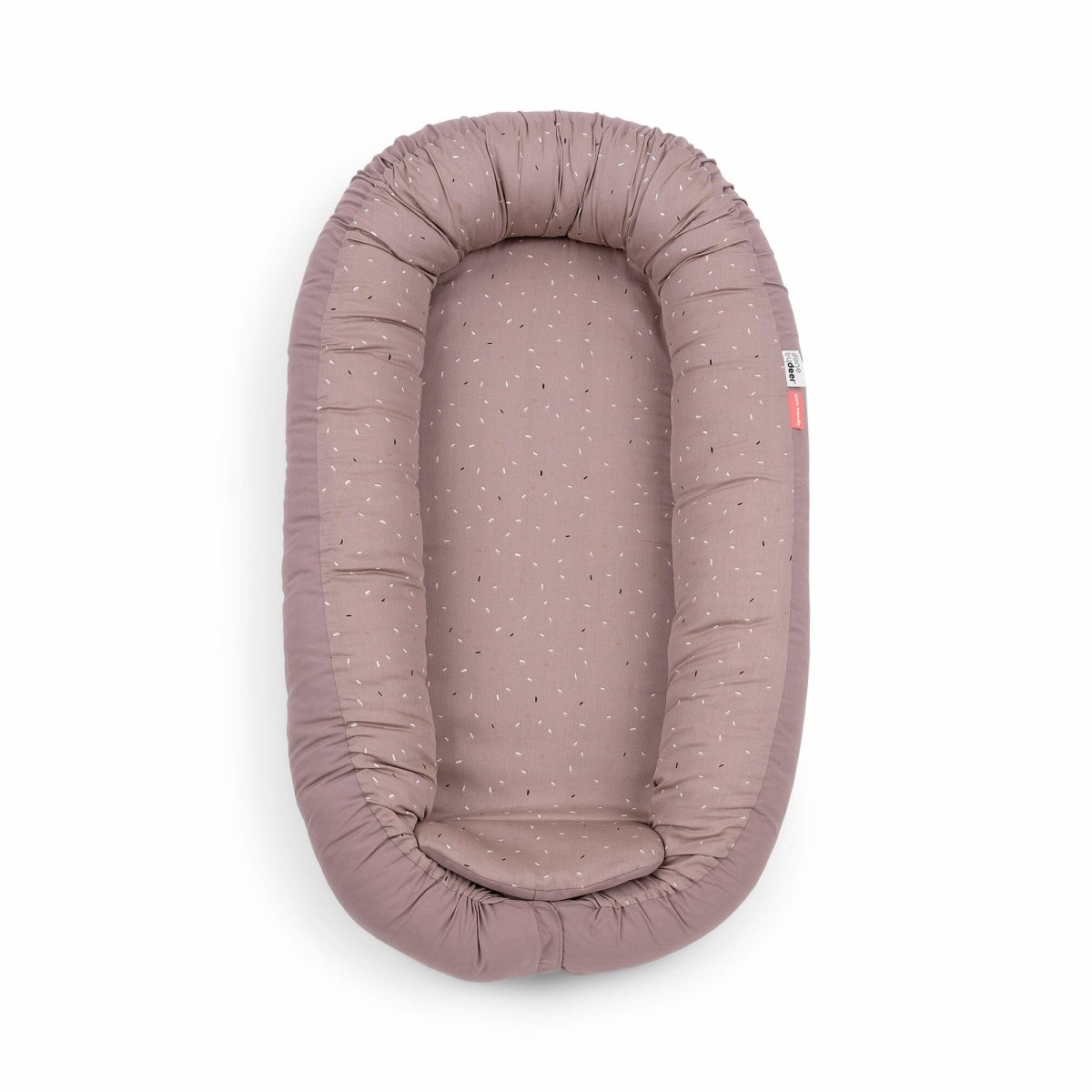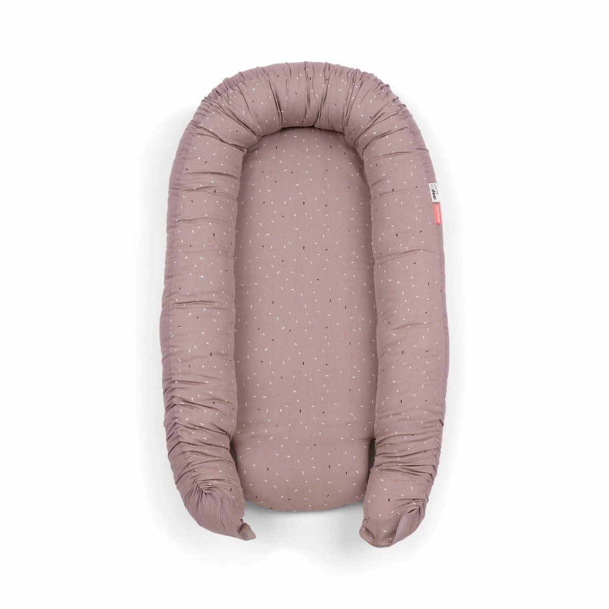 Het licht poeder knusse nestje is aan de binnenkant bestrooid met feestelijke confetti en heeft een effen poederkleur aan de buitenkant. Het babynestje is gemaakt van zacht katoen met polyester vulling en heeft een zacht schuimrubberen matrasje uit één stuk.