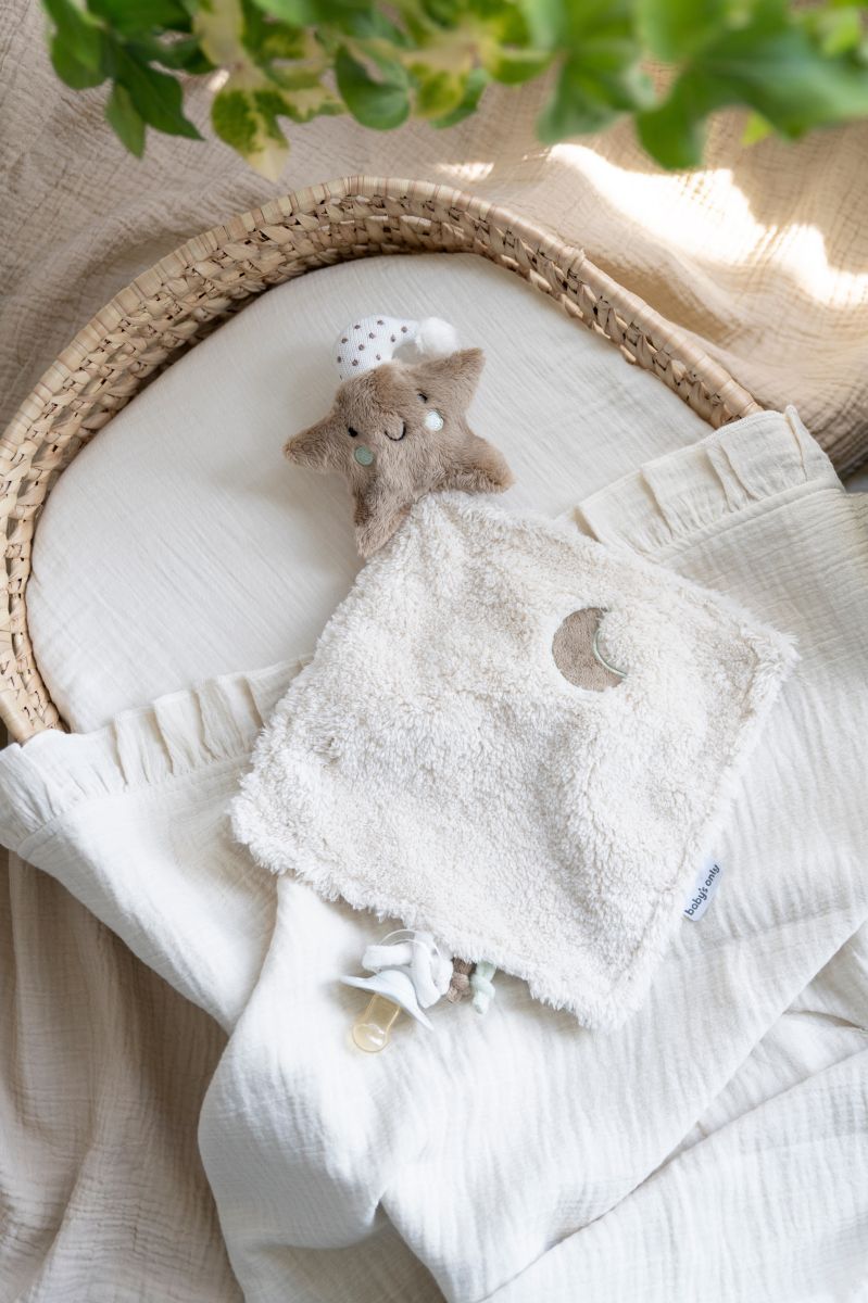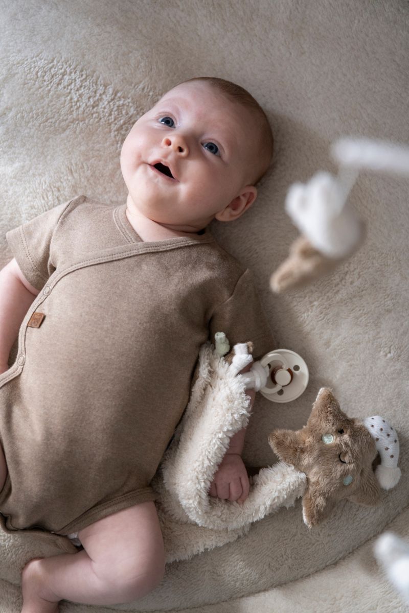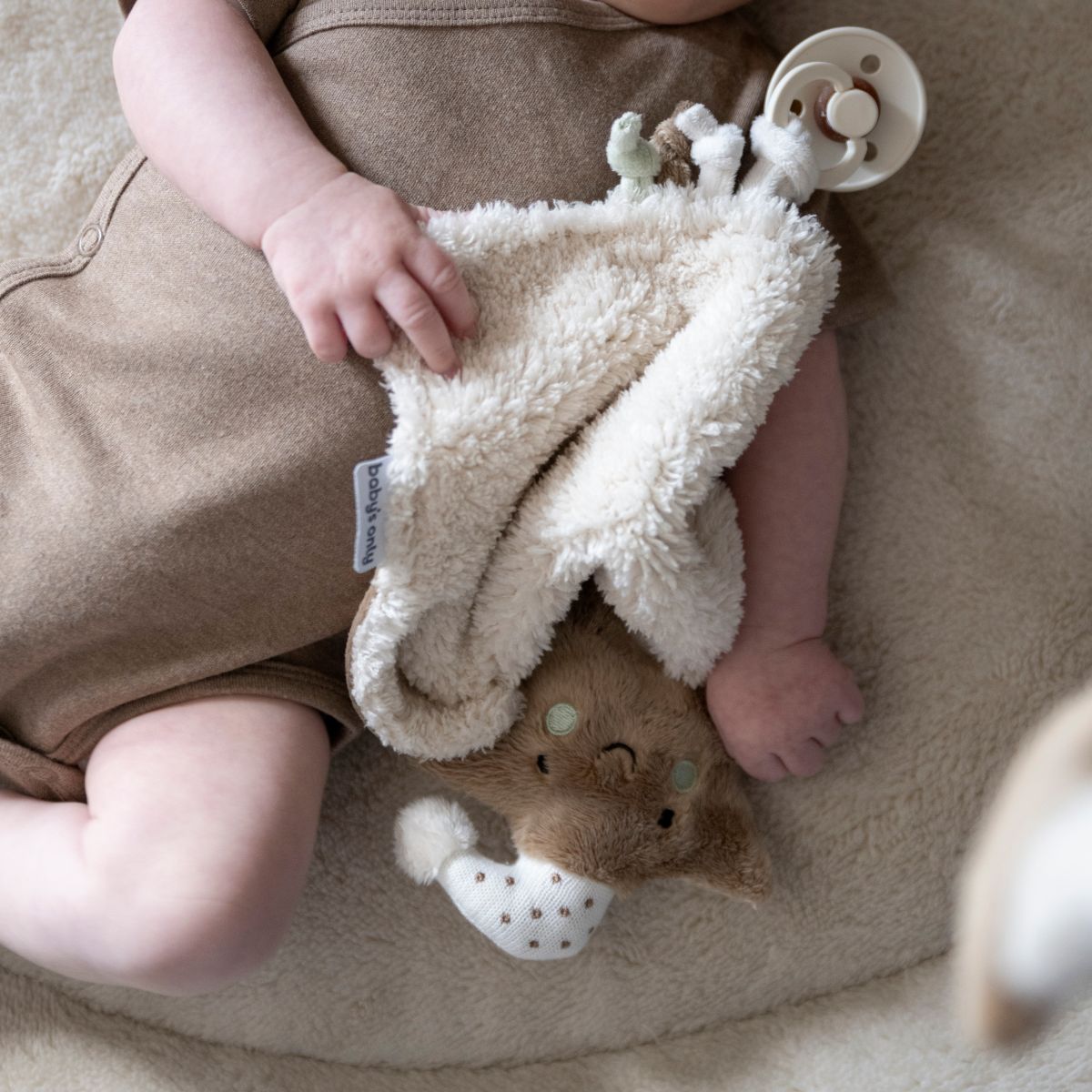 Het knuffeldoekje in warme, neutrale aardetinten en beige is gemaakt van verschillende materialen, zoals teddyfleece, zacht velours en gebreid en geborduurd polyestergaren – perfect voor kleine ontdekkers. Of het nu gaat om de zachte stof om mee te knuffelen of de interessante structuren om te voelen en op te sabbelen, er valt veel te ontdekken. Wanneer je op het sterretje drukt, hoor je een vrolijk piepje, wat zorgt voor extra speelplezier en kleine verrassingsmomenten.