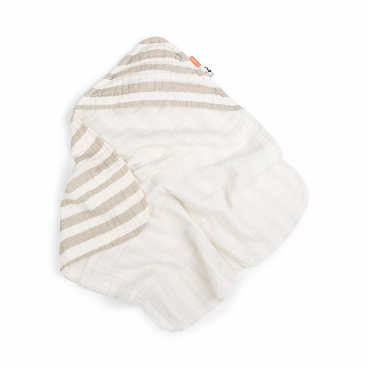 De handdoek met capuchon en brede strepen is perfect om je kleintje in te wikkelen en af te drogen na een heerlijk badje. De zachte meerlaagse handdoek van biologisch katoen is licht, glad op de huid en droogt snel op tijdens een uitstapje naar het strand.