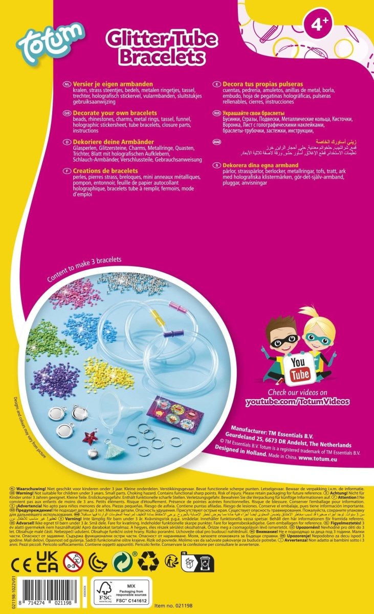 Superleuk deze nieuwste bedel armbandjes van Totum: vul je eigen 3 buisarmbandjes met meer dan 2400 solid glittersteentjes in vrolijke kleuren. Kies je eigen kleurencombinaties en versier ze met bedels. Sluit ze veilig af en kies en mix om er iedere dag plezier aan te believen