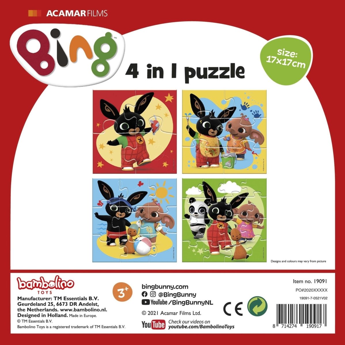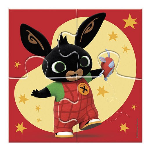 Deze set bestaat uit 4 puzzels met elk een kleurrijke afbeelding van Bing, alleen of samen met één van zijn vele, vrolijke vriendjes Sula, Panda en knuffelvriend Flor. Puzzelen is een van de eerste bezigheden waarmee een kind de motoriek traint. De jongste puzzelaars beginnen met een puzzel van 4 stukken en wie toe is aan de volgende uitdaging kan een puzzel van 6, 9 of 16 stukken leggen.