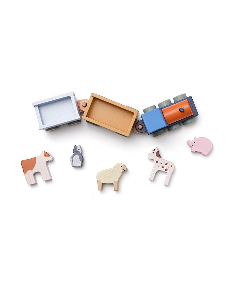 Allemaal instappen op de boerderijtrein! Deze charmante houten trein wordt geleverd met twee wagons en vijf lieve boerderijdieren: Mira de koe, Max het paard, Poppy het varken, Bella het schaap en Sture de kat. Kinderen kunnen de dieren in de wagons laden en hun eigen verhalen verzinnen terwijl ze de trein voortduwen.