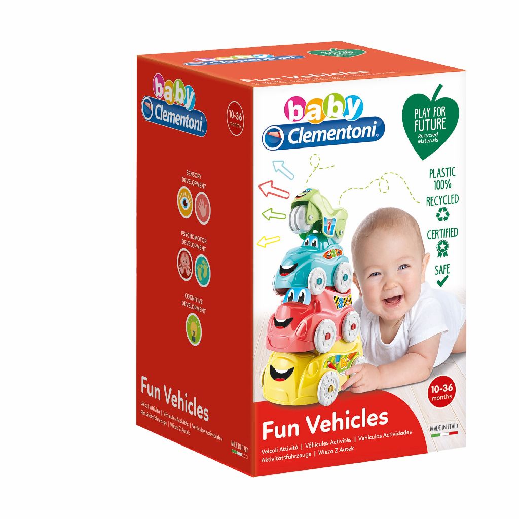 Vier leuke voertuigen van Clementoni: een bus, een vrachtwagen, een auto en een motor waarmee je kan spelen, opstapelen en meer kunt ontdekken. Stimuleert de manuele vaardigheden, goede coördinatie en reflexen en visuele perceptie en relatie oorzaak - gevolg. Dit artikel uit de Play for Future lijn van Clementoni bevat 80 procent gerecycled plastic. Geschikt voor kinderen van 6 tot 36 maanden.
