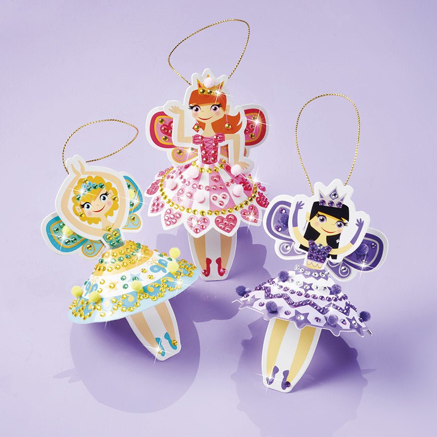 Versier eerst de elfjes zelf met strass steentjes en maak daarna hun outfit compleet door de rokken van de elfjes ook mooi te versieren met steentjes en pom poms.