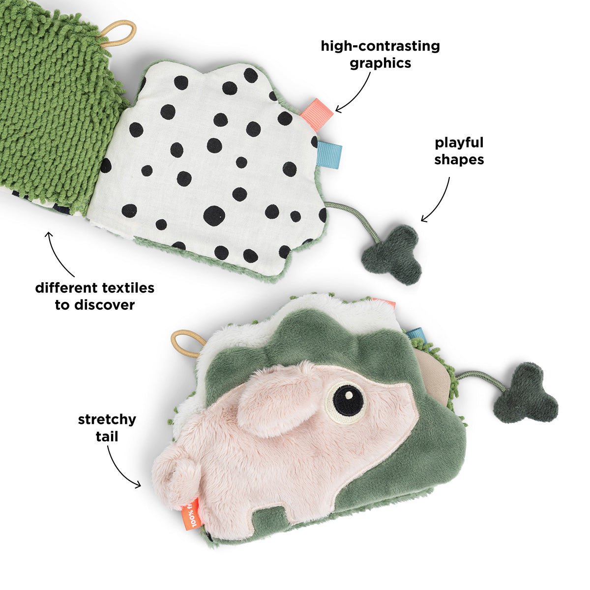 - Zintuiglijke elementen zoals knisperen, kralen en verschillende texturen stimuleren het gehoor en de tastzin van je baby.