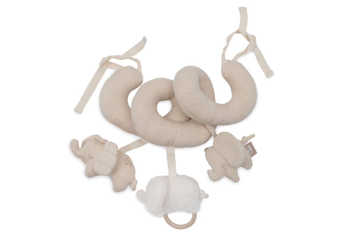 Deze vrolijke activiteitenspiraal uit de Elephant Tales collectie is speciaal ontworpen om de zintuigen van je baby te prikkelen en de motorische ontwikkeling te stimuleren. Met drie schattige olifantjes, elk met hun eigen unieke uitstraling—een gemaakt van zachte ribstof, een met ruitjes oren en de derde van luxe velvet stof—biedt deze spiraal diverse texturen en kleuren die de nieuwsgierigheid van je kleintje wekken. Je bevestigt hem eenvoudig om het handvat van de Maxi-Cosi of aan de box, zodat je baby altijd zijn of haar favoriete speeltjes bij de hand heeft.