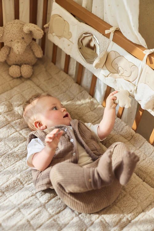 Deze schattige rammelaar met ring maakt een vrolijk geluidje en is heerlijk om vast te houden voor je kleintje. De geborduurde vlekjes, de oren met geruite print en de geborduurde ogen maken het ontwerp extra lief. Het staartje in de vorm van een knoop en het Jollein label geven de rammelaar maken deze rammelaar extra interessant voor je mini. Perfect voor het ontwikkelen van de zintuigen van je baby!