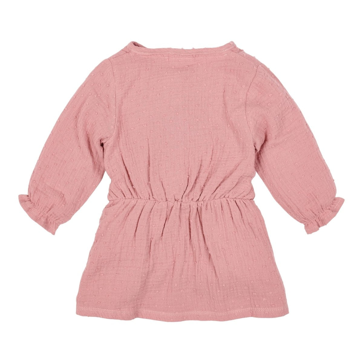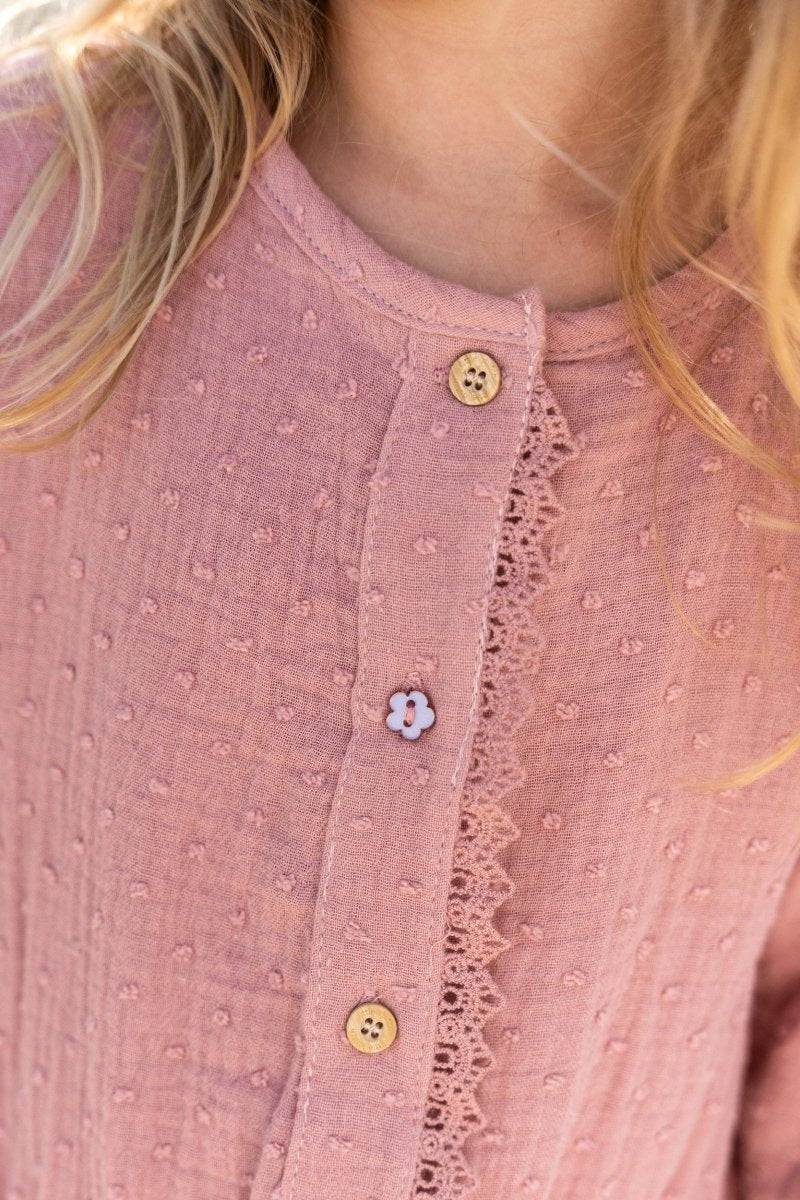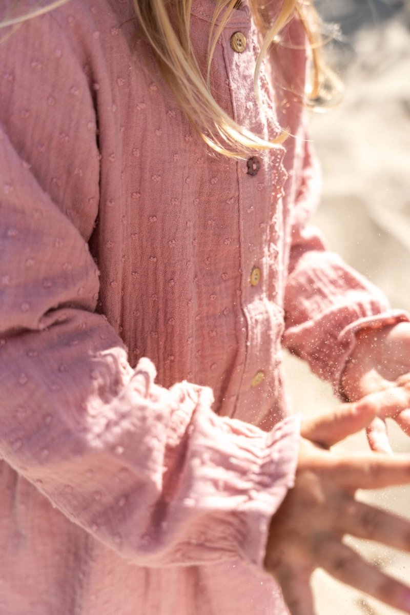 Een lief jurkje voor elke dag. Dit jurkje in Pink Blush is gemaakt van een geweven stof met een subtiel ingeweven stipje, wat zorgt voor een zachte en verfijnde uitstraling.