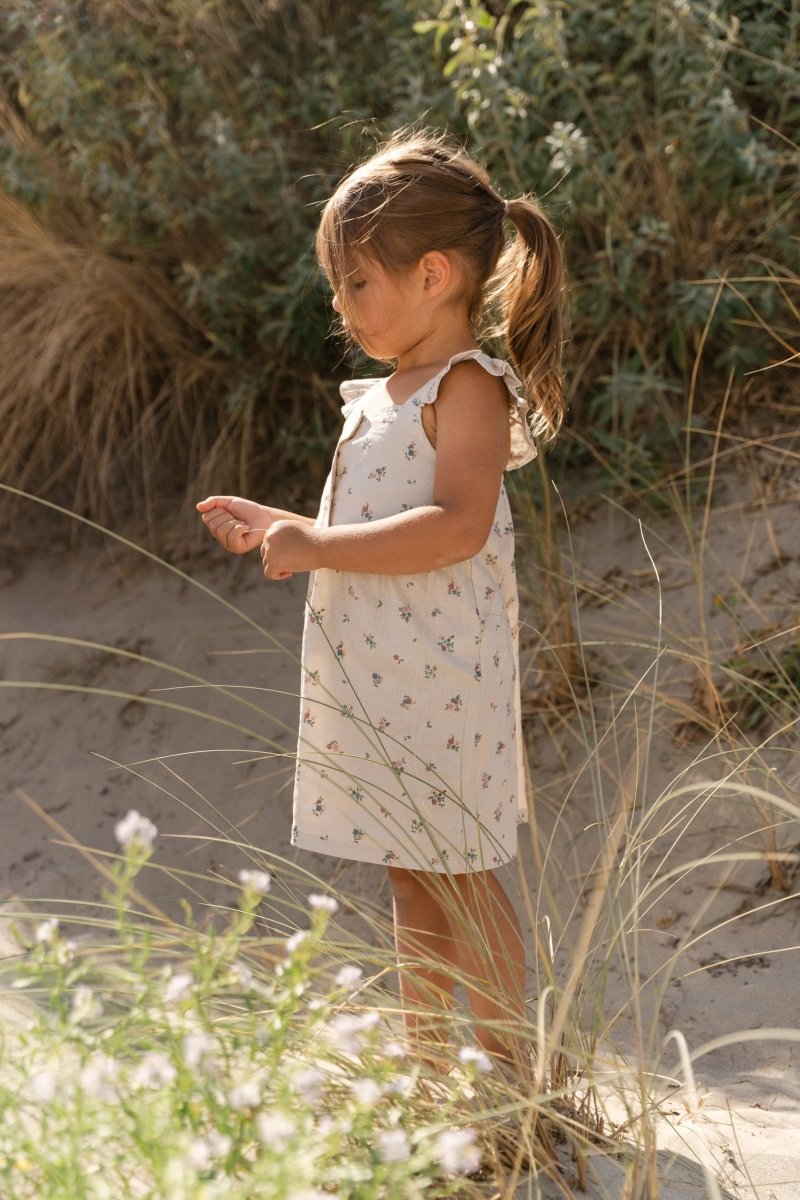 Een zomers jurkje vol charme. Dit mouwloze jurkje in Fairy Bloom is gemaakt van een geweven stof met een natuurlijke linnen look. De zachte bloemenprint maakt het jurkje extra bijzonder en perfect voor zonnige dagen vol kleine ontdekkingen.