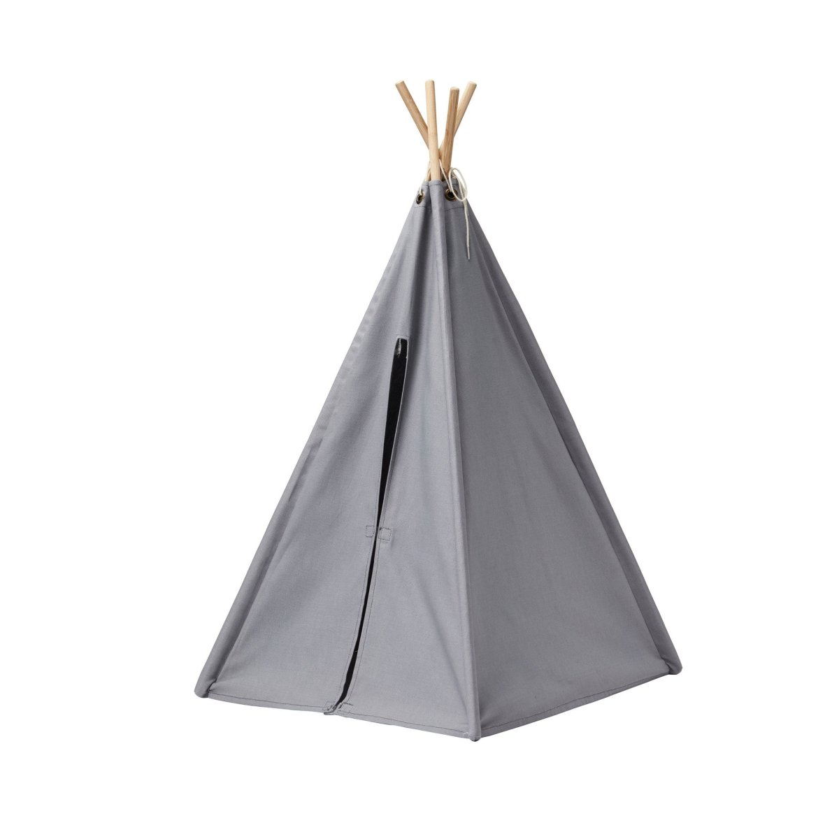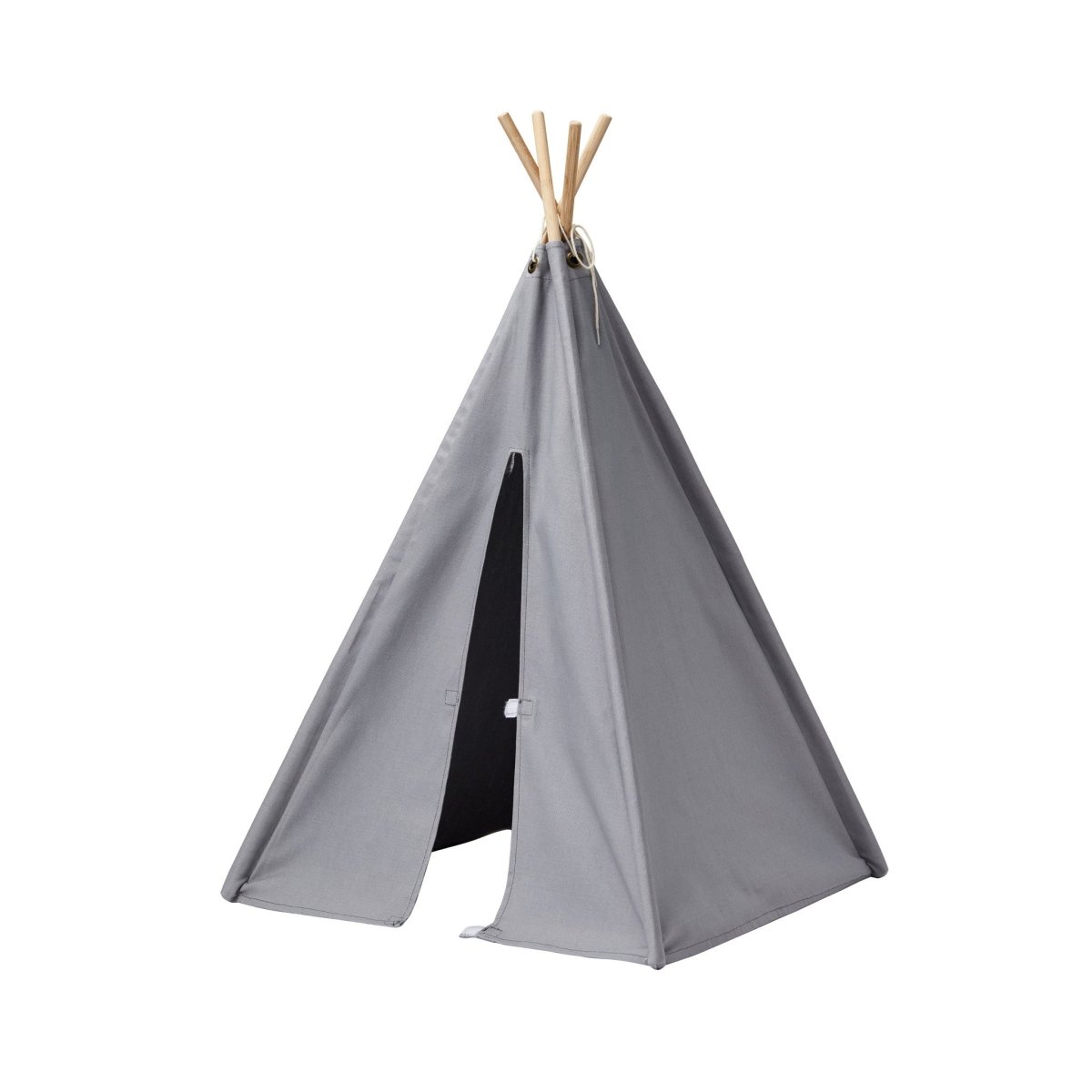 Grijze mini tipi tent in een eenvoudig ontwerp. Is perfect als plek om te spelen of gezellig te zijn. Het product is niet brandvertragend omdat de chemicaliën in de behandeling niet zijn goedgekeurd volgens de "REACH" wetgeving.