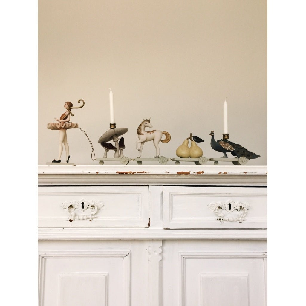 - Ballerina die loopt met paddenstoelen, een eenhoorn, peren en een pauw