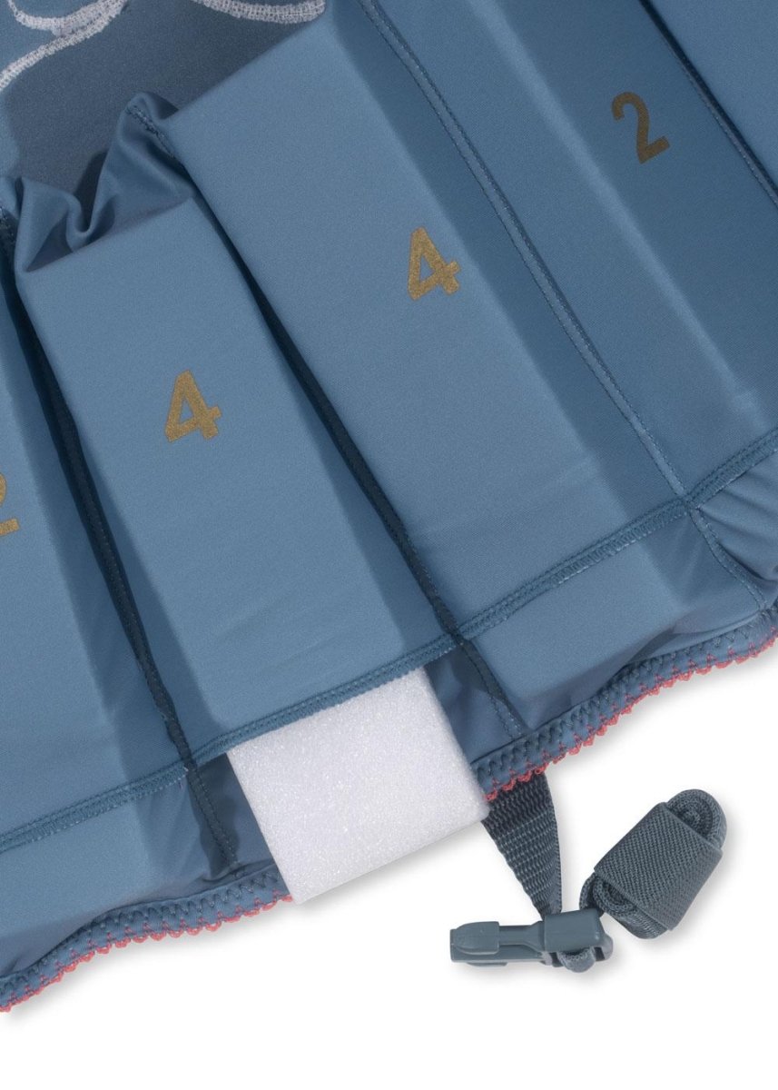 Onze zwemvesten zijn ontworpen met schuimrubberen drijfstokken aan de binnenkant die kunnen worden aangepast aan de vaardigheden en behoeften van het kind. De drijfstokken kunnen gemakkelijk één voor één worden verwijderd naarmate je kind zijn zwemvaardigheden ontwikkelt. Verwijder de stokken altijd per twee, te beginnen met 1 & 1, dan 2 & 2 enzovoort totdat je kind volledig aangepast is aan het zelfstandig zwemmen.
