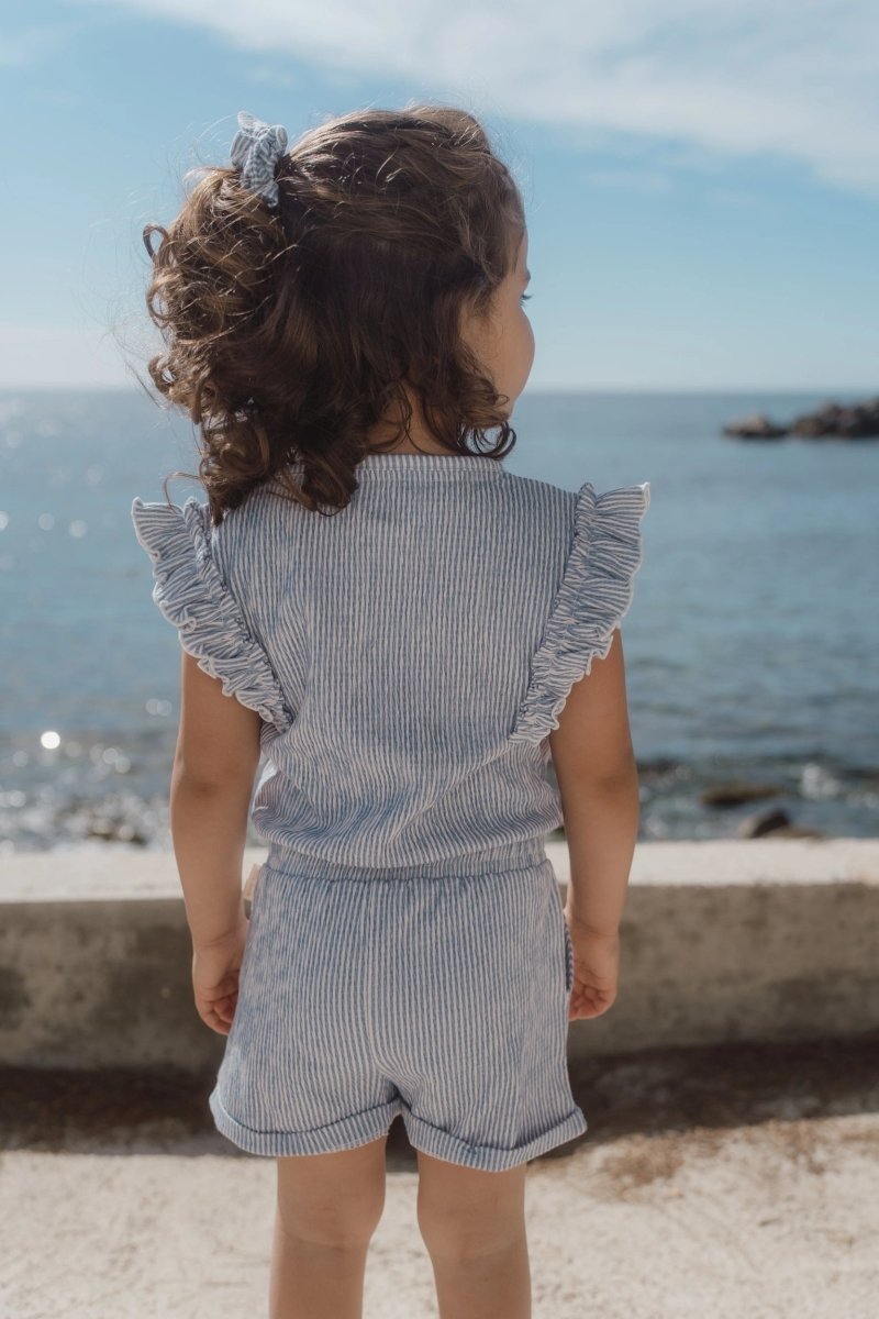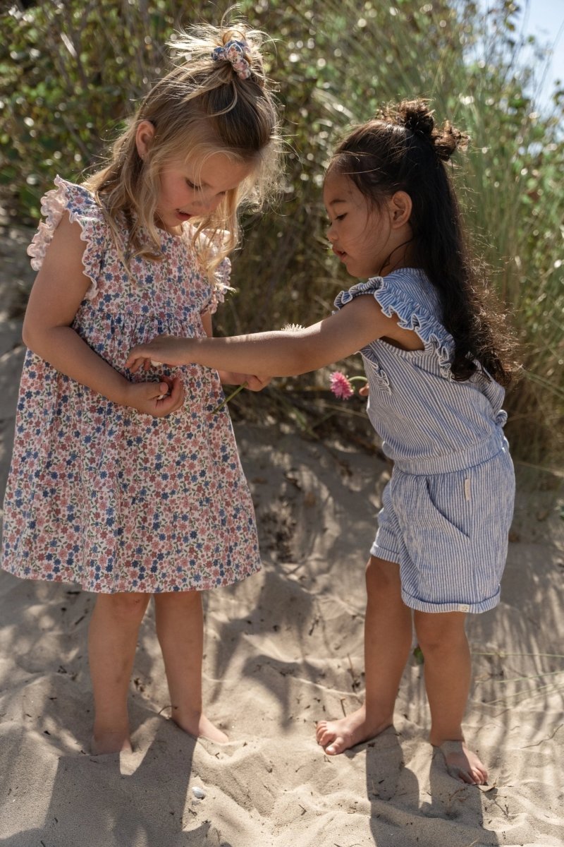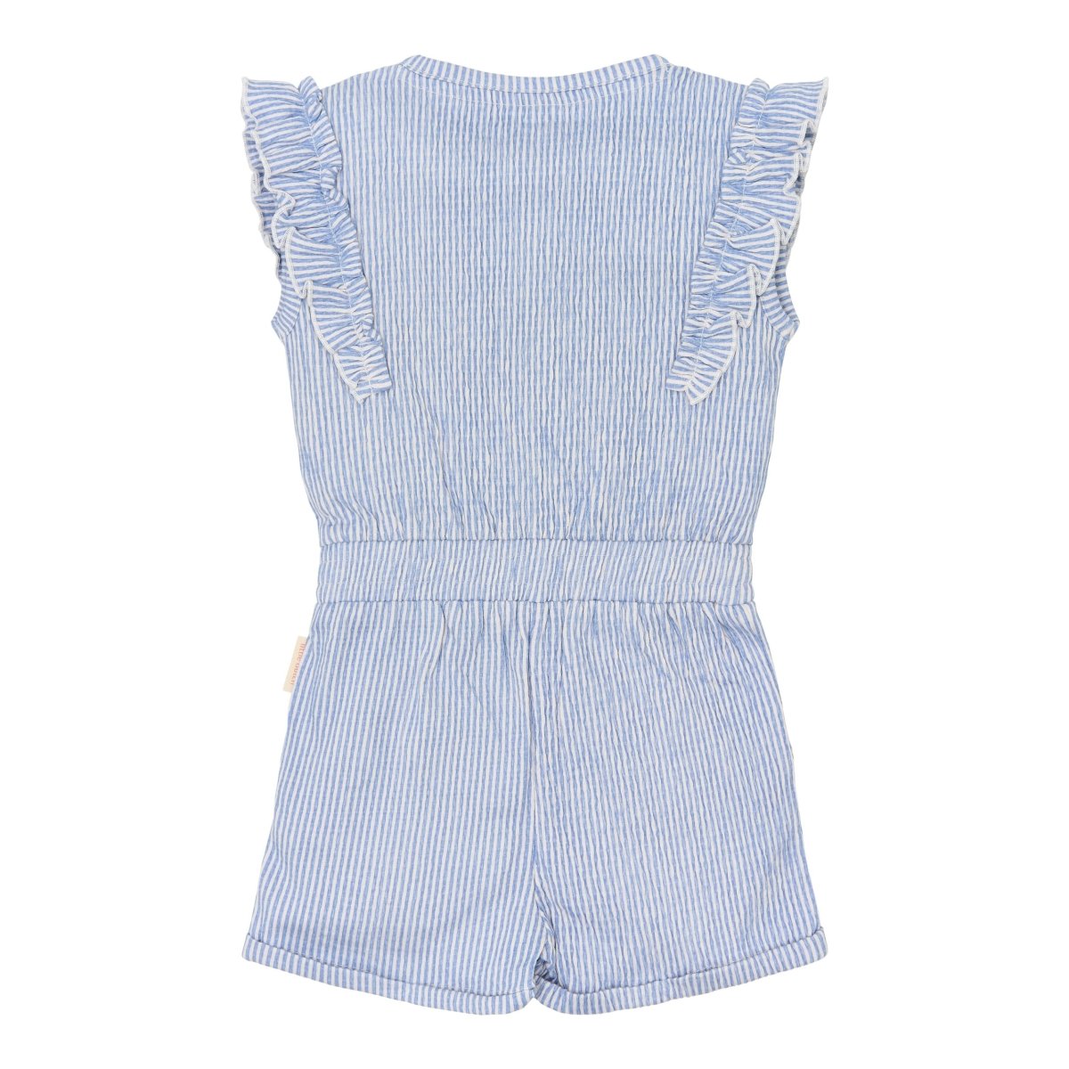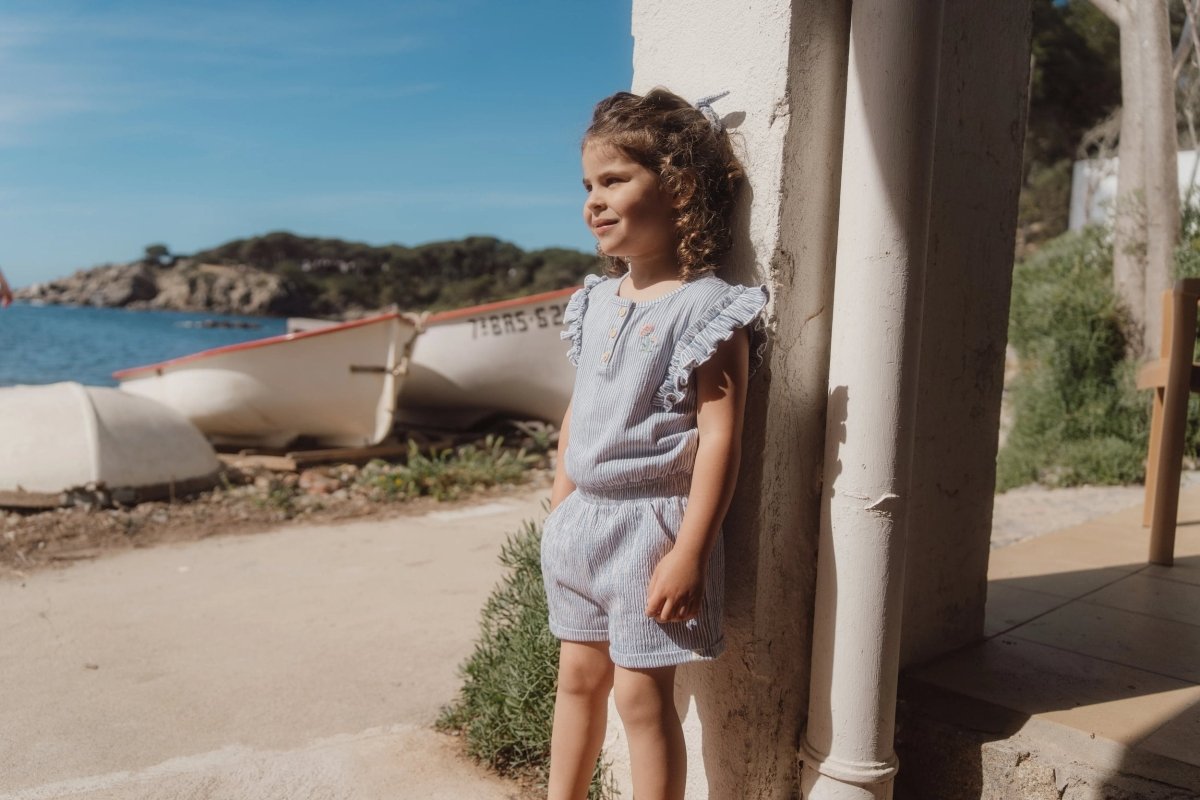 Speels, comfortabel en helemaal klaar voor zonnige dagen. Dit korte tuinpak in Denim Blue Stripe is gemaakt van een zachte crinkle kwaliteit met stretch, waardoor het soepel meebeweegt met elke beweging. Het smalle streepje geeft het tuinpak een frisse en tijdloze uitstraling.