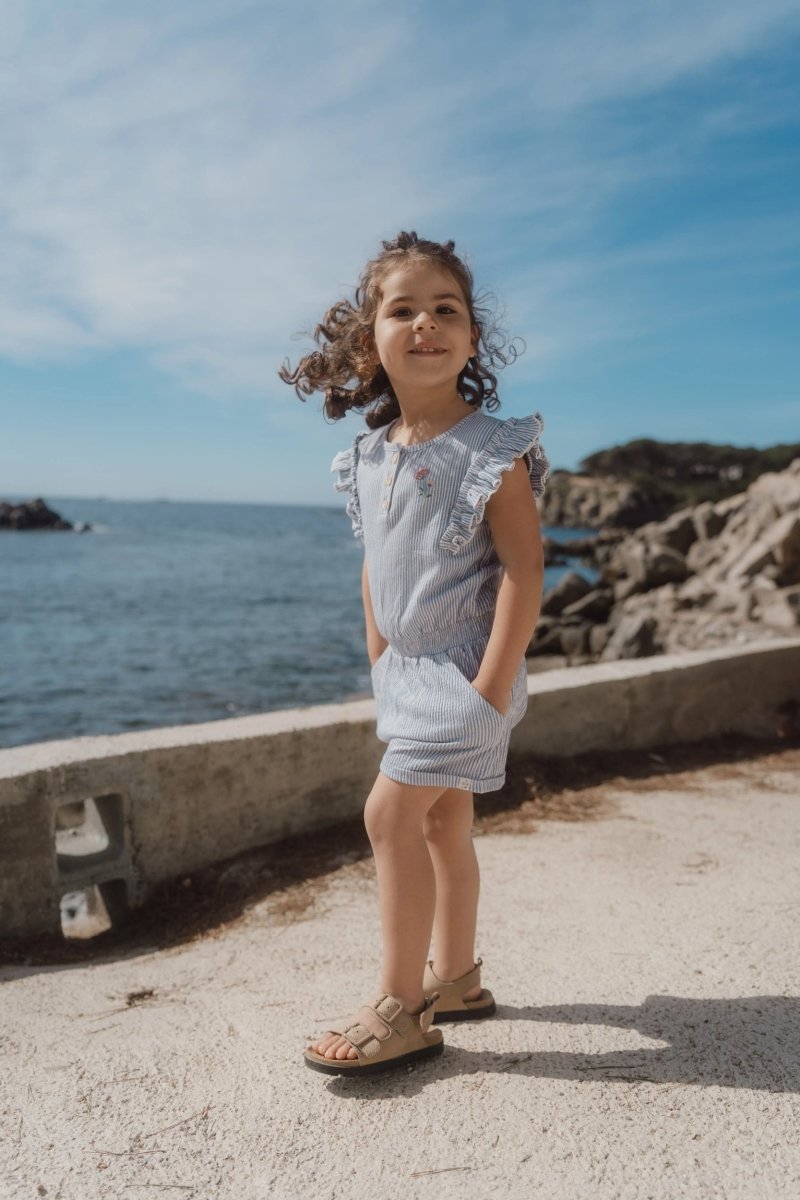 De ruches over de schouders zorgen voor een vrolijk en lief accent. Dankzij de elastische tailleband en de knoopsluiting middenvoor gaat aan- en uitkleden eenvoudig en snel. Gemaakt van biologisch katoen en Oeko-Tex gecertificeerd – voor een veilige en verantwoorde keuze, elke dag weer. Een compleet outfitje voor dagen vol spel, ontdekking en kleine geluksmomentjes.