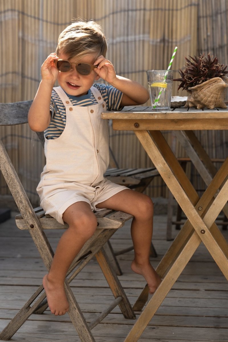 Zacht van kleur en speels van stijl: dit korte tuinpak in gemêleerde zandkleur is gemaakt van een geweven linnen-look stof die licht en luchtig aanvoelt. Ideaal voor zomerse avonturen. De verstelbare schouderbandjes met houtlook knoopjes geven het tuinpak een natuurlijke uitstraling, terwijl de zijzakken ruimte bieden voor kleine schatten onderweg. Gemaakt van 100% biologisch katoen en Oeko-Tex gecertificeerd, is het comfortabel, duurzaam en vriendelijk voor de huid.