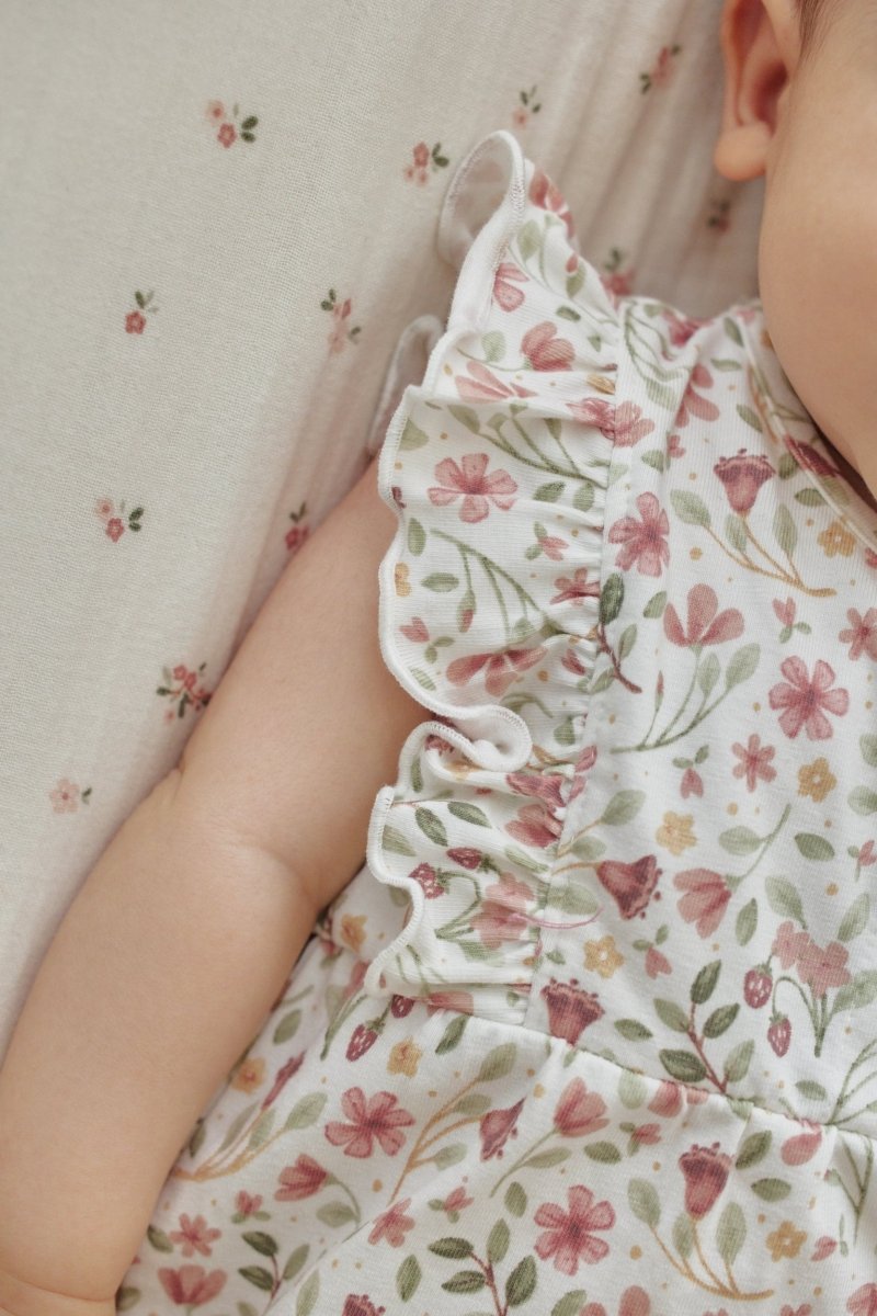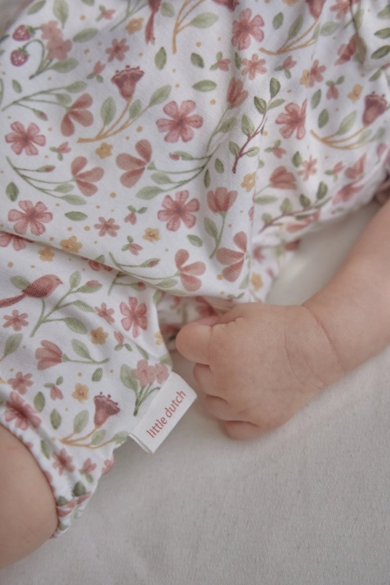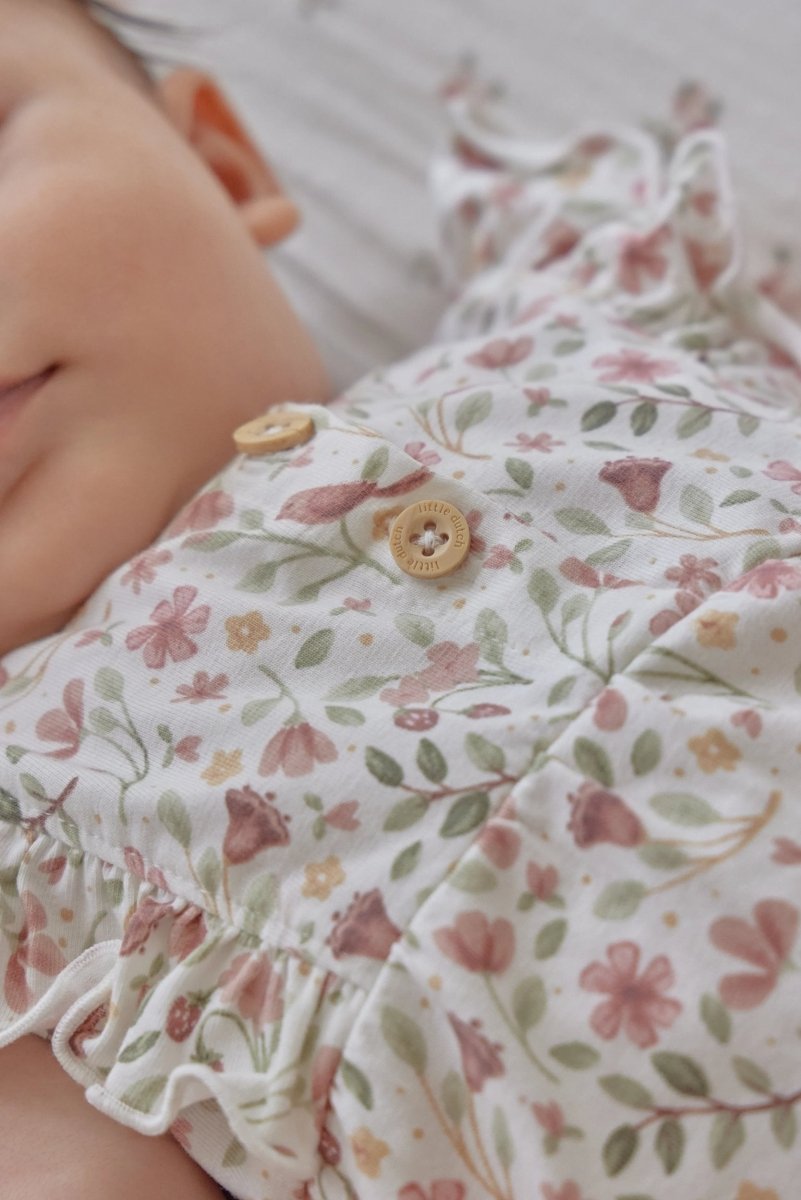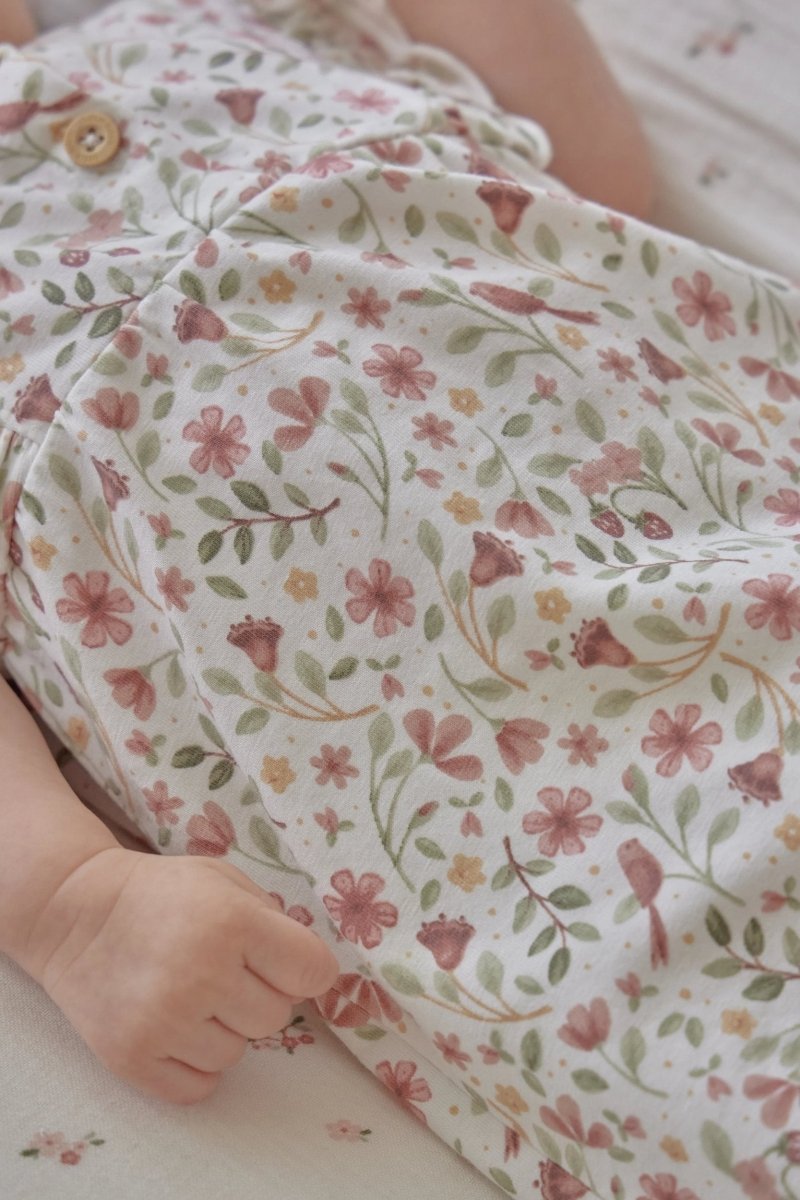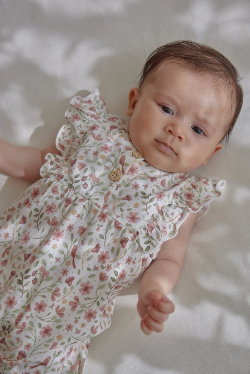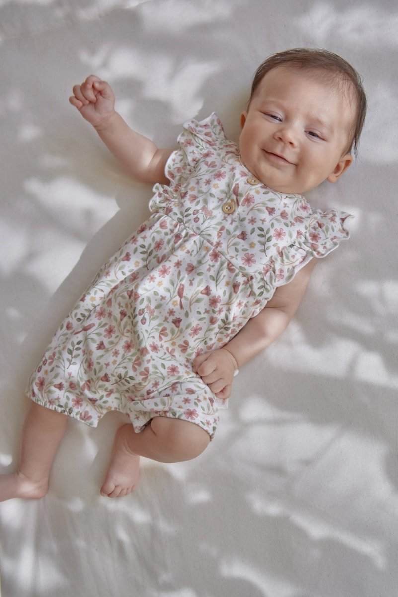 Een dag vol verwondering begint met dit korte tuinpak uit de Fairy Wonders collectie. De zachte stof, vrolijke Fairy Garden print en verfijnde details maken dit een favoriet item voor elke zonnige dag. De speelse ruches over de schouders geven het tuinpak een lieve uitstraling, terwijl de hout-look knoopjes zorgen voor een natuurlijke, charmante touch. Dankzij de handige drukknoopjes in het kruis gaat aan- en uitkleden moeiteloos.
