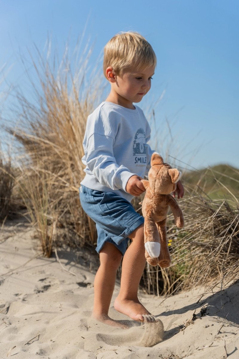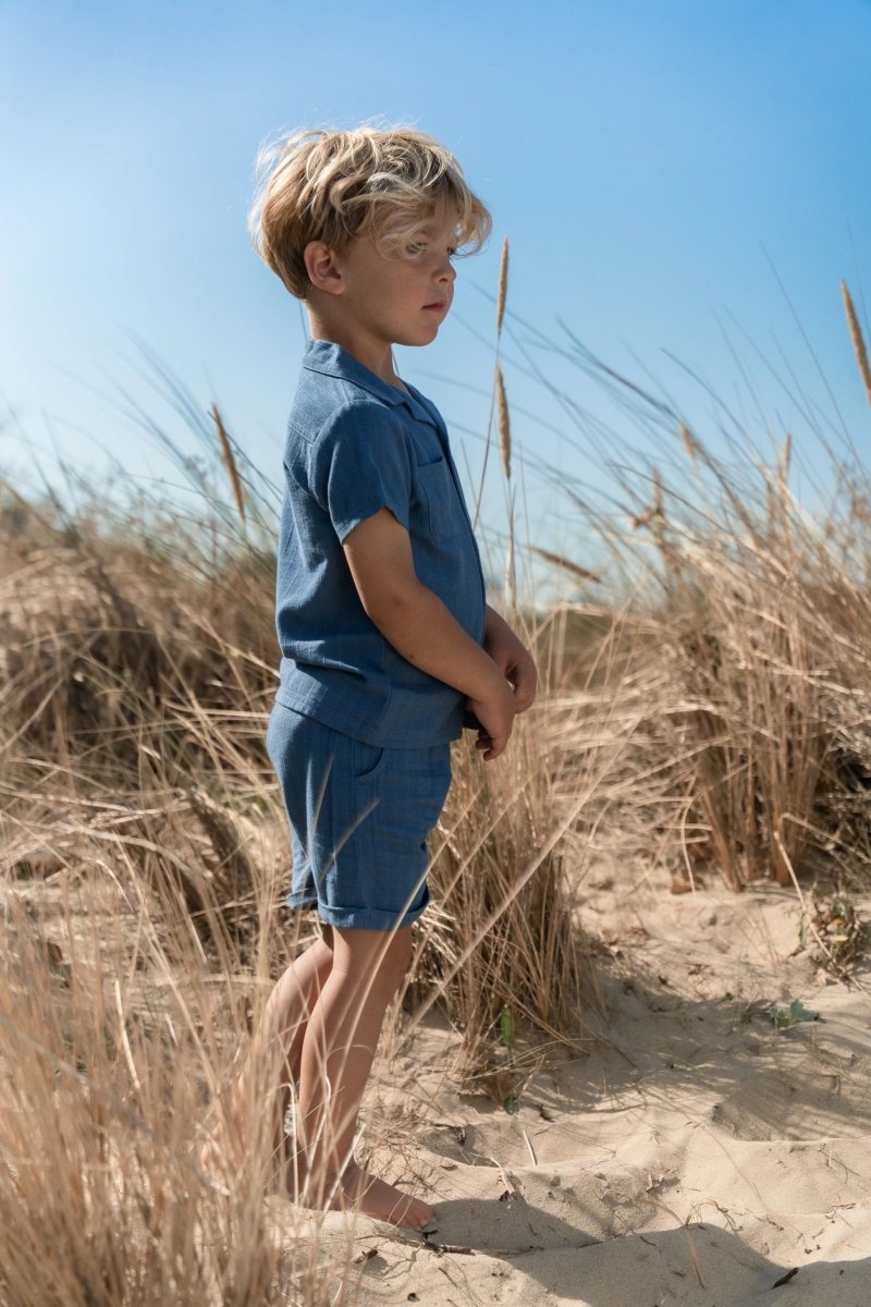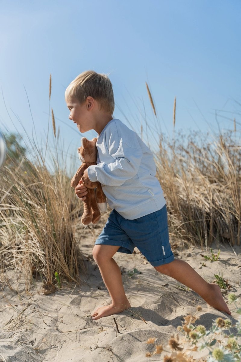 Luchtig, stoer en perfect voor zonnige dagen: deze korte broek in Indigo is gemaakt van een comfortabele linnen-look stof met subtiel streepreliëf. De elastische tailleband met koordje zorgt voor een fijne pasvorm, terwijl de omslag bij de pijpen en de steekzakjes een speels accent geven. Gemaakt van 55% viscose en 45% biologisch katoen, Oeko-Tex gecertificeerd, voelt de broek zacht en ademend aan.