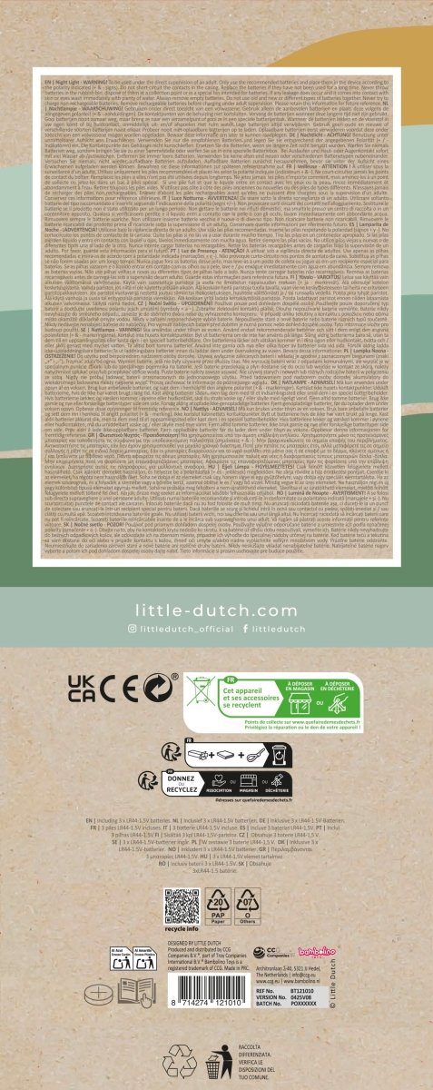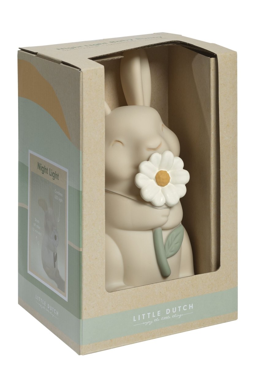 Maak kennis met het schattige Little Dutch konijn! Het nachtlampje verspreidt een zacht licht in de kinderkamer. Het lampje gaat makkelijk aan of uit door de schakelaar aan de onderzijde van de lamp en gaat automatisch uit na 12 minuten om batterijen te besparen. Dit nachtlampje werkt op 3 LR44-knoopcel batterijen (inbegrepen).