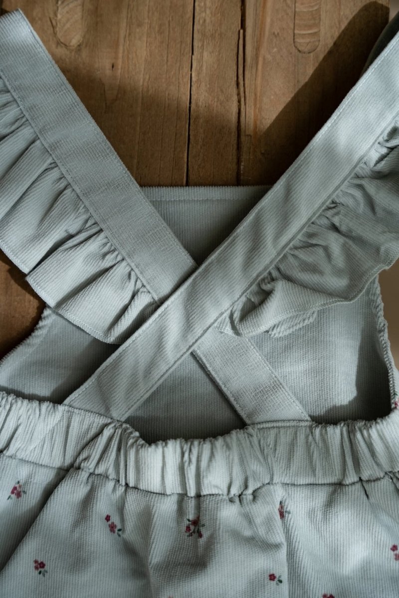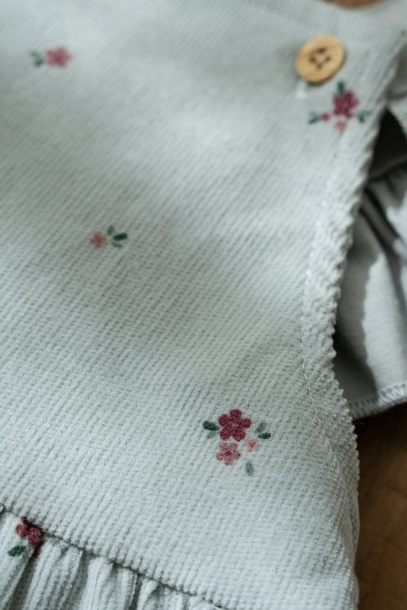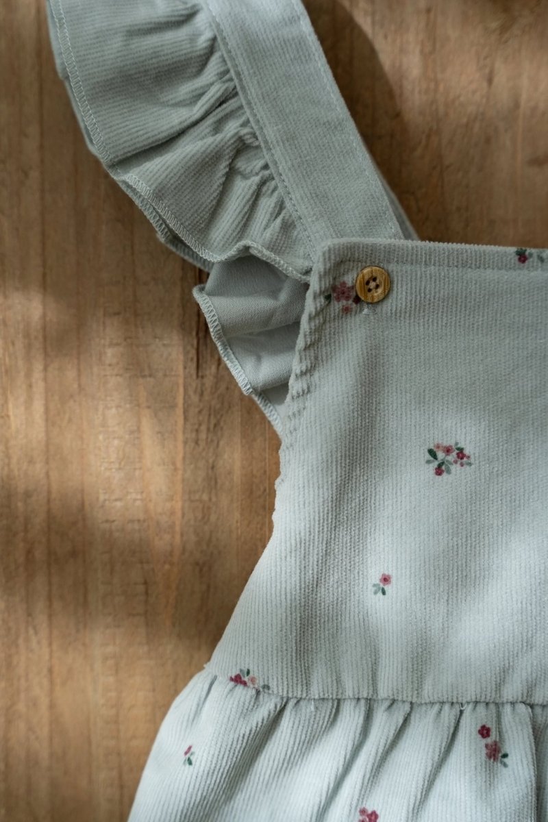 Deze corduroy jurk zonder mouwen is uitgevoerd met een all-over bloemenprint en afgewerkt met speelse ruffles aan de schouderbanden. De stof bestaat uit 98% biologisch katoen en 2% elastaan, wat zorgt voor een comfortabele pasvorm met een lichte stretch. Dankzij het gebruik van biologisch katoen en de Oeko-Tex certificering is de jurk niet alleen stijlvol, maar ook verantwoord en huidvriendelijk.