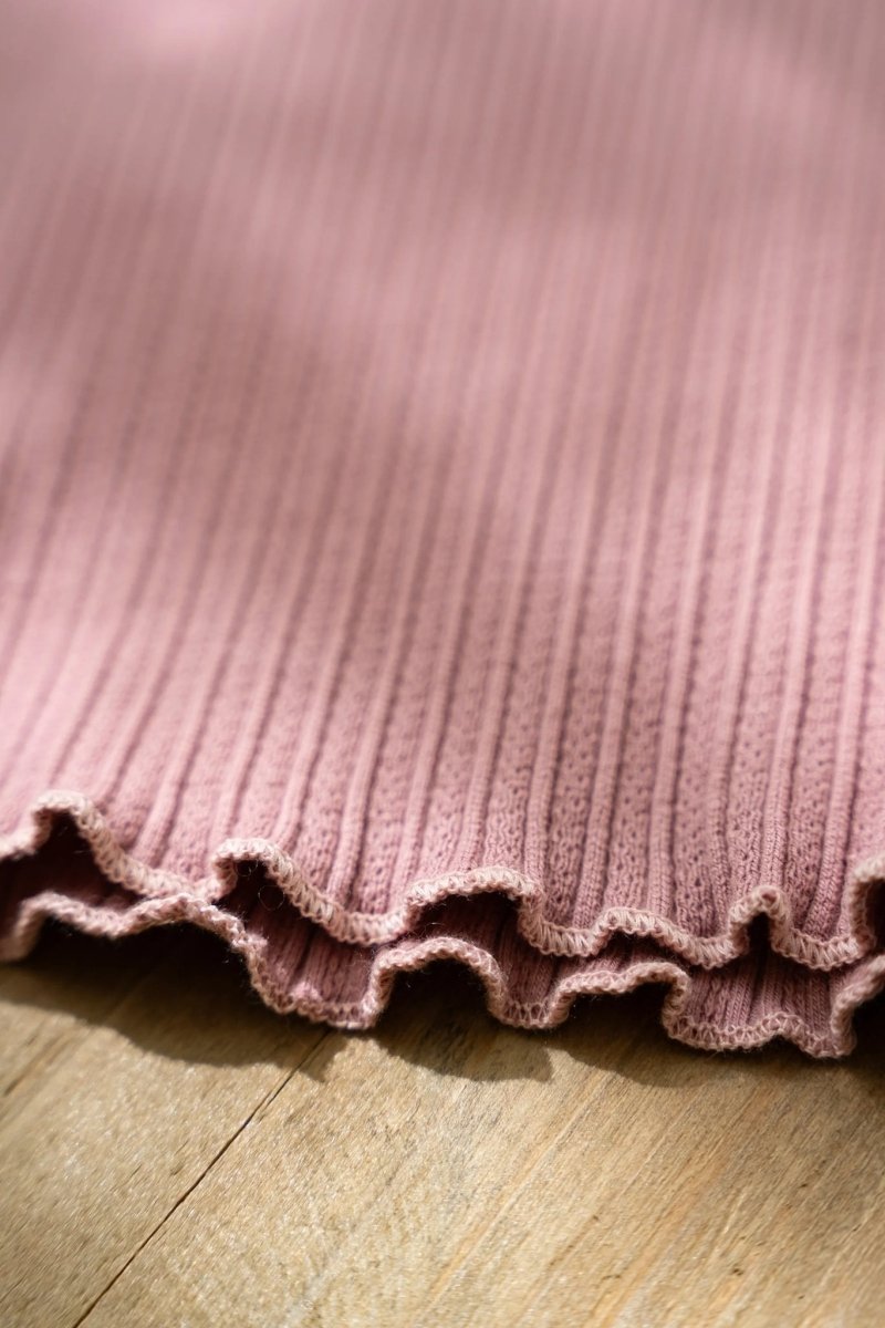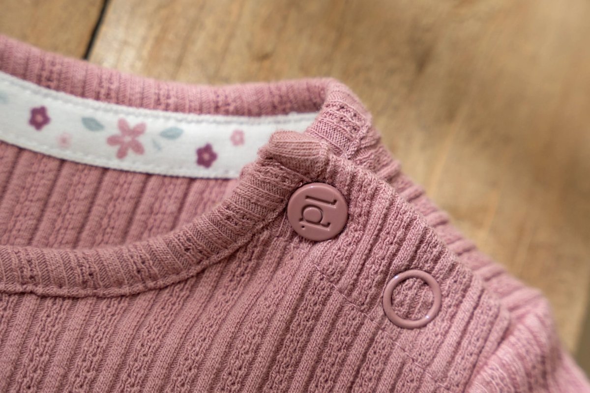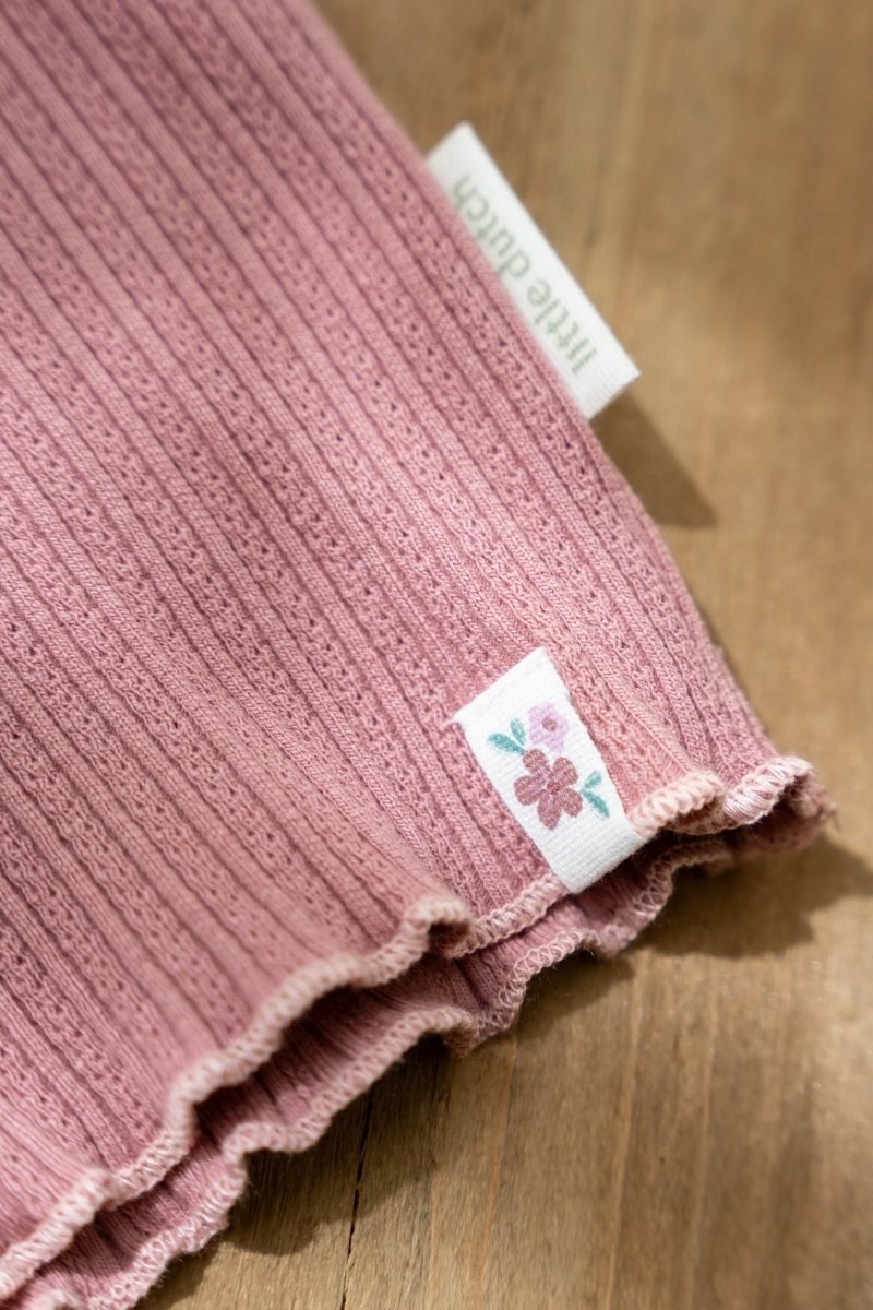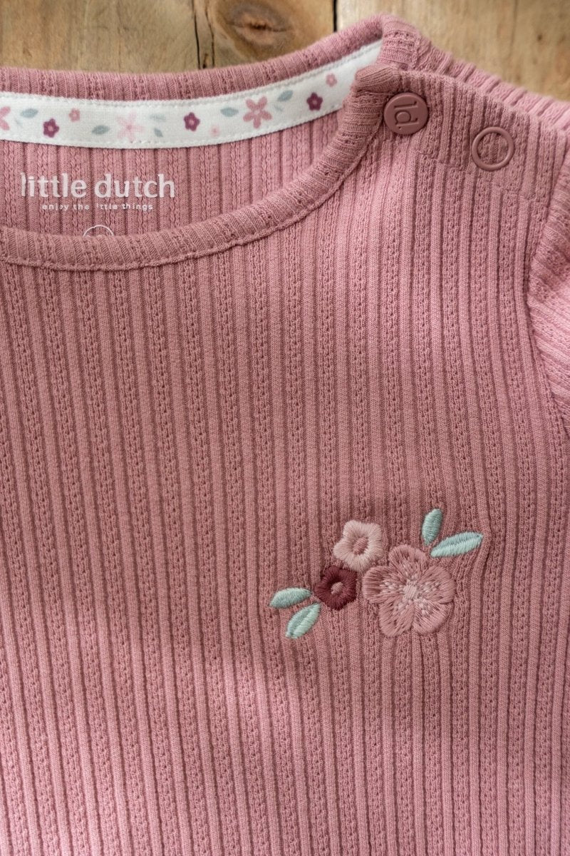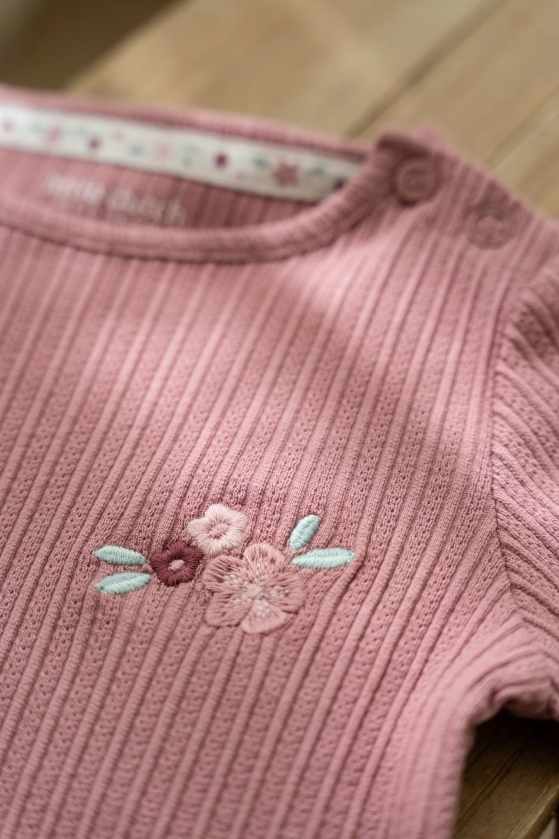 Dit ribstructuur shirt is gemaakt van 95% biologisch katoen en 5% elastaan, waardoor het zacht aanvoelt en een comfortabele stretch heeft. Het shirt is afgewerkt met contrasterend stiksel aan de onderkant en een subtiel bloemenborduursel, wat het een speelse en stijlvolle uitstraling geeft. Dankzij het gebruik van biologisch katoen en de Oeko-Tex certificering is het shirt huidvriendelijk en vrij van schadelijke stoffen.