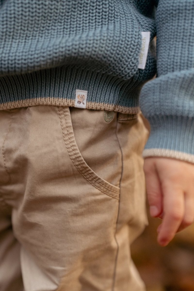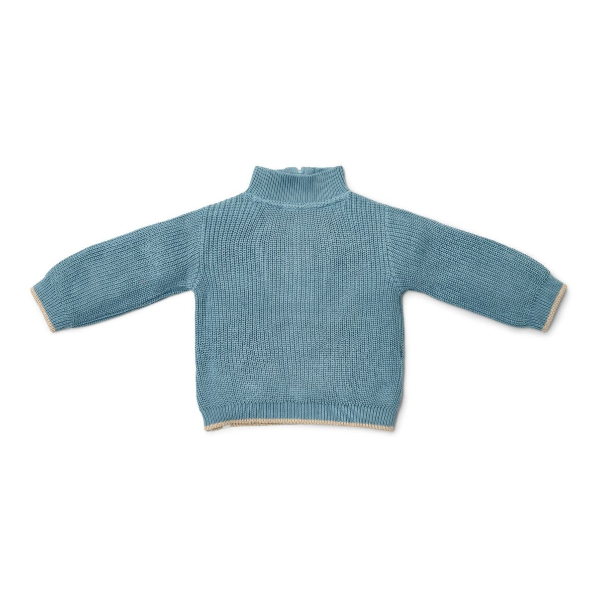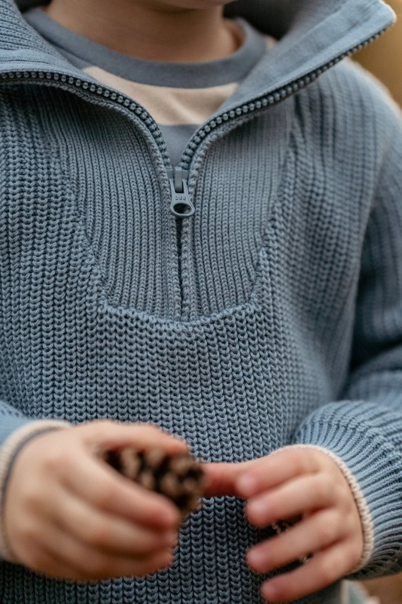 Warme gebreide trui, kraag met rits, contrast strepen aan de onderkant en mouwen, gemaakt van biologisch katoen, Oekotex gecertificeerd. 100% biologisch katoen