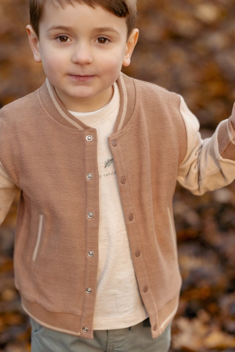Warm vest met klein structuurtje in de stof, drukknoop sluiting midden voor, steekzakken aan de voorkant, contrast streepjes in de boorden van de mouwen, onderkant en nek, gemaakt van biologisch katoen, Oekotex gecertificeerd. 100% biologisch katoen