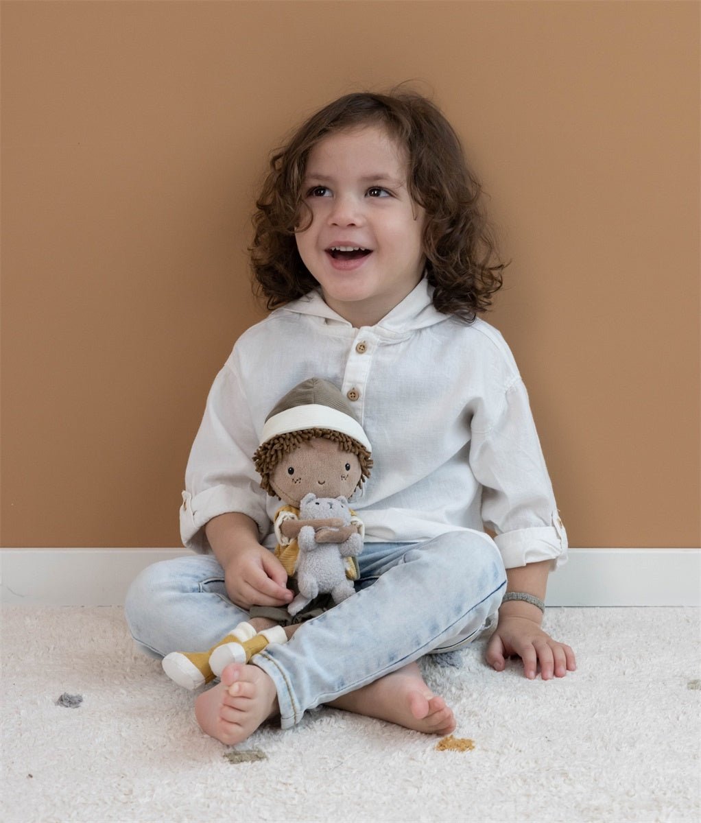 Maak kennis met mooie Jake. Deze pluche pop met zijn coole muts en gele regenlaarzen kan niet wachten om geknuffeld te worden. Jake wordt je nieuwe beste vriend. Hij zal er altijd zijn als je wilt spelen of een dikke knuffel nodig hebt. Samen met zijn grijze kat gaat hij graag op zoek naar kleine schatten. Of het nu in huis is of op het strand, hij weet altijd iets bijzonders te vinden. Wat wordt de eerste schat die jullie samen vinden? Jake is zacht en knuffelig, 35 cm groot en wordt geleverd in een mooie opbergdoos.