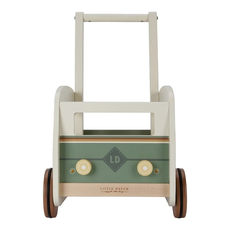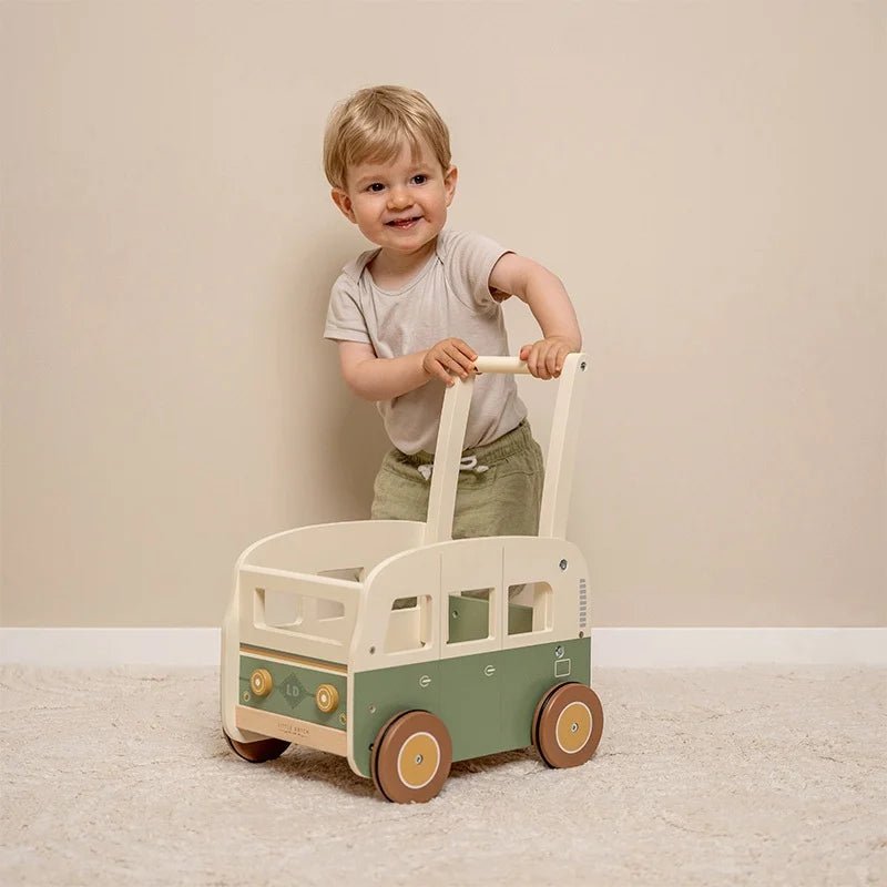 En hop, daar ga je! Op avontuur door de woonkamer met deze Vintage loopwagen. Stap voor stap leer je lopen, en deze duwkar helpt je erbij. Dus start je motor en doe net alsof je de bestuurder bent van deze supercoole bus. De houten Vintage loopwagen is niet alleen handig om je beginnende loper te helpen. Maar het vintage surfersbusje ontwerp is ook een perfecte speelgoedkist voor je baby. Je kleintje kan er speelgoed in stoppen voor fantasierijk spel binnenshuis of het meenemen op wandelavonturen! Geweldig voor de ontwikkeling van evenwicht, coördinatie en motoriek. En dankzij de rubberen strips om de wielen hoef je je geen zorgen te maken over je vloer als je kindje door de kamer cruist.