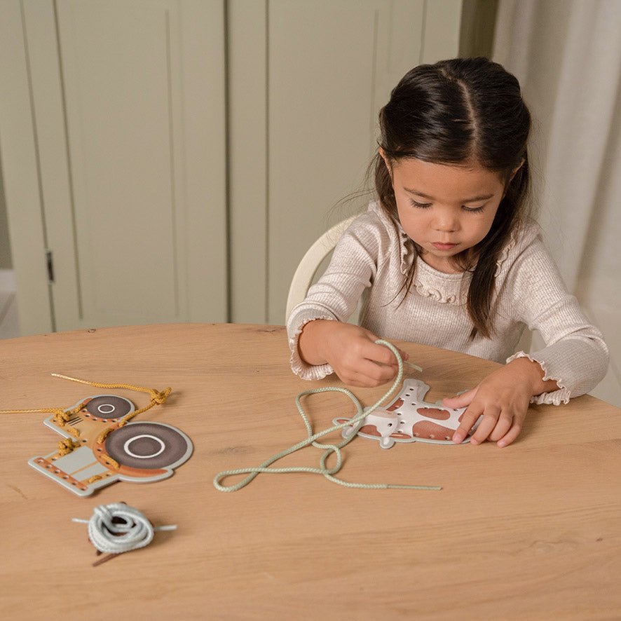 Beleef telkens een nieuw avontuur op de boerderij met deze kartonnen rijgfiguren van Little Dutch. Deze set bestaat uit 5 grote, stevige kartonnen kaarten, met afbeeldingen van o.a. een tractor, schaap en koe. Rijgen bevordert de oog- handcoördinatie en is goed voor de ontwikkeling van de fijne motoriek. Inclusief 4 veters om mee te rijgen.