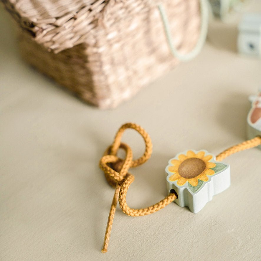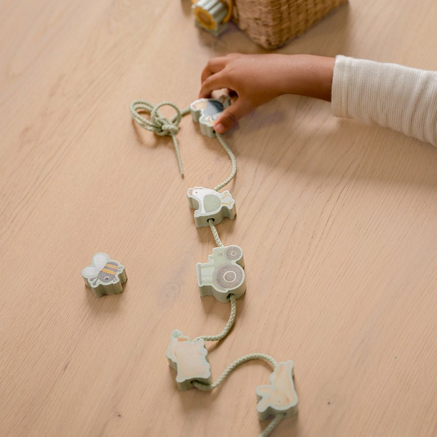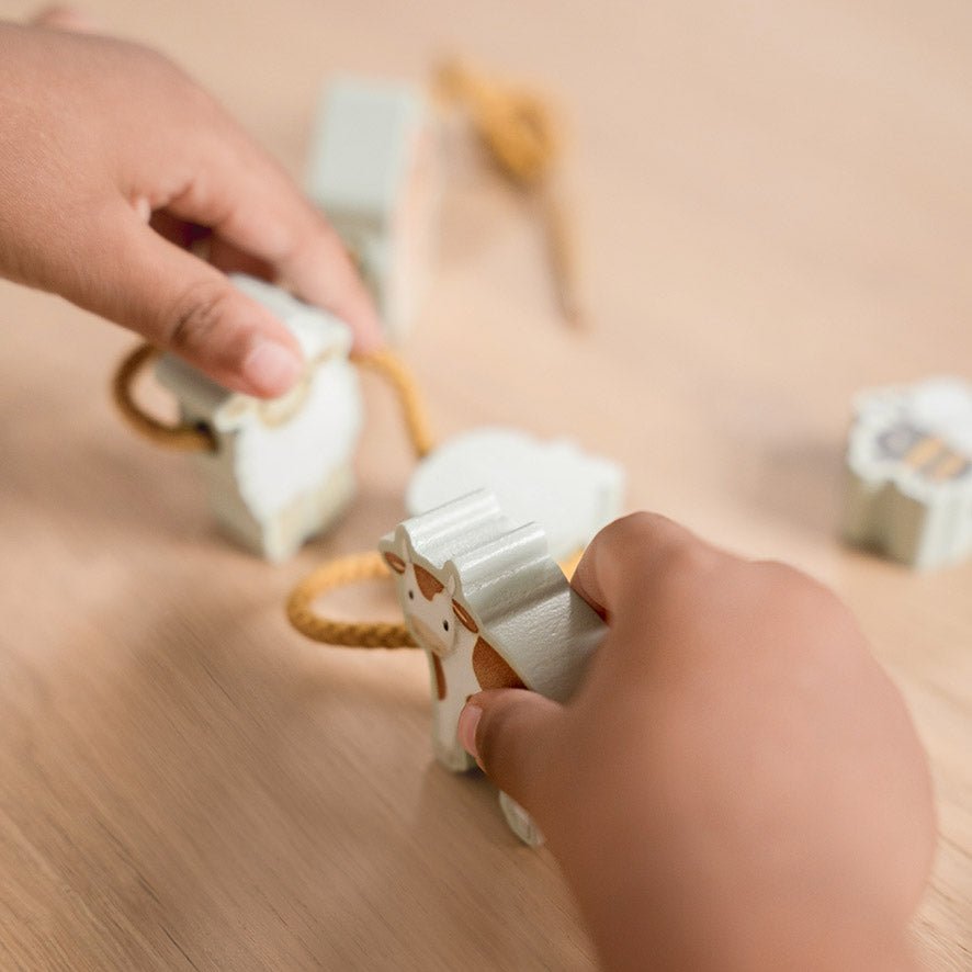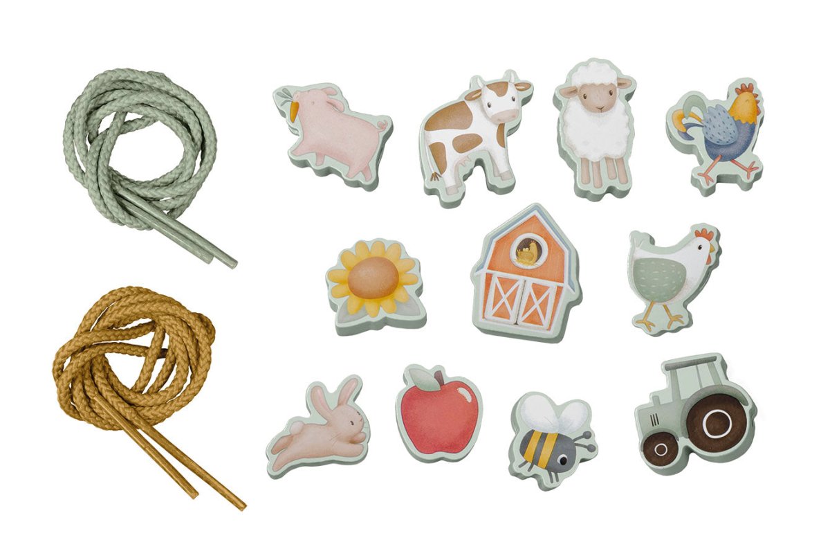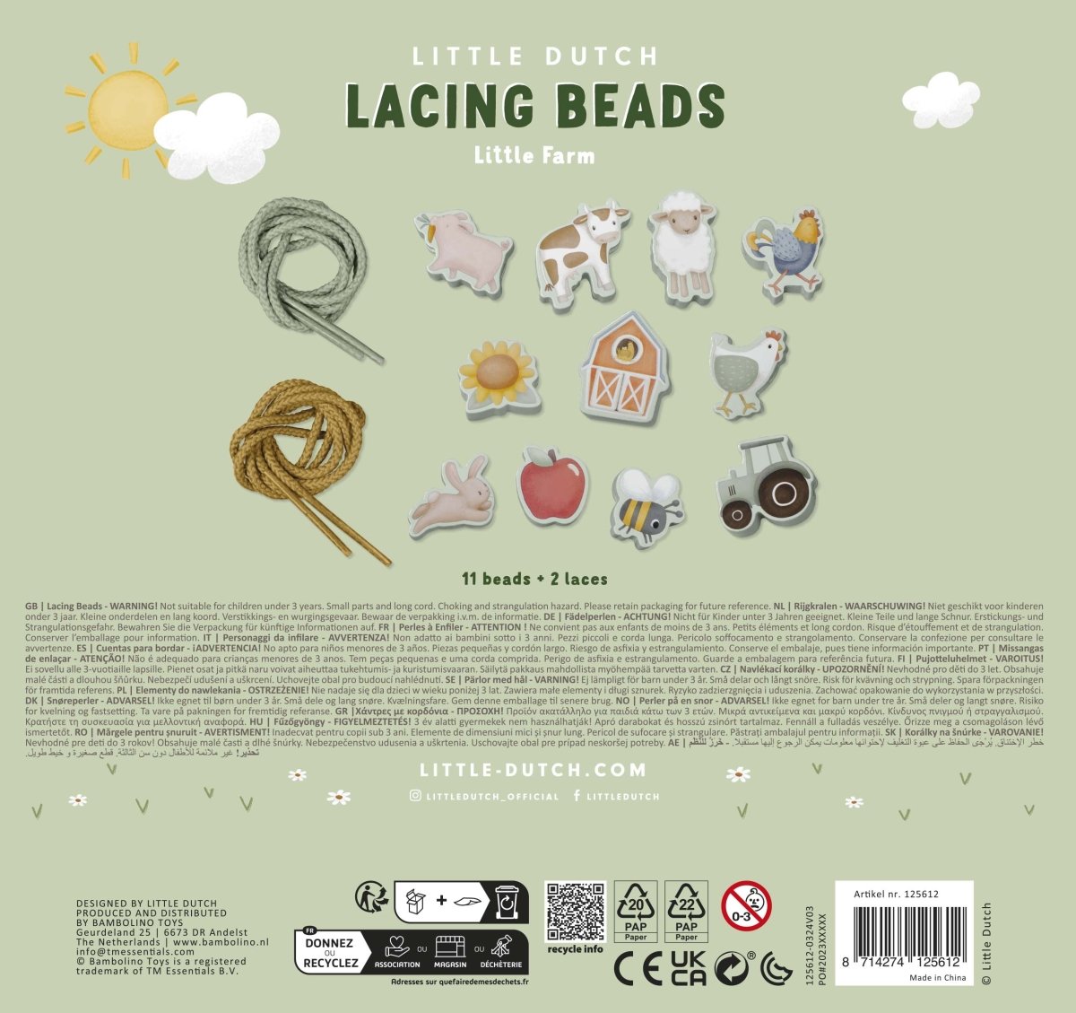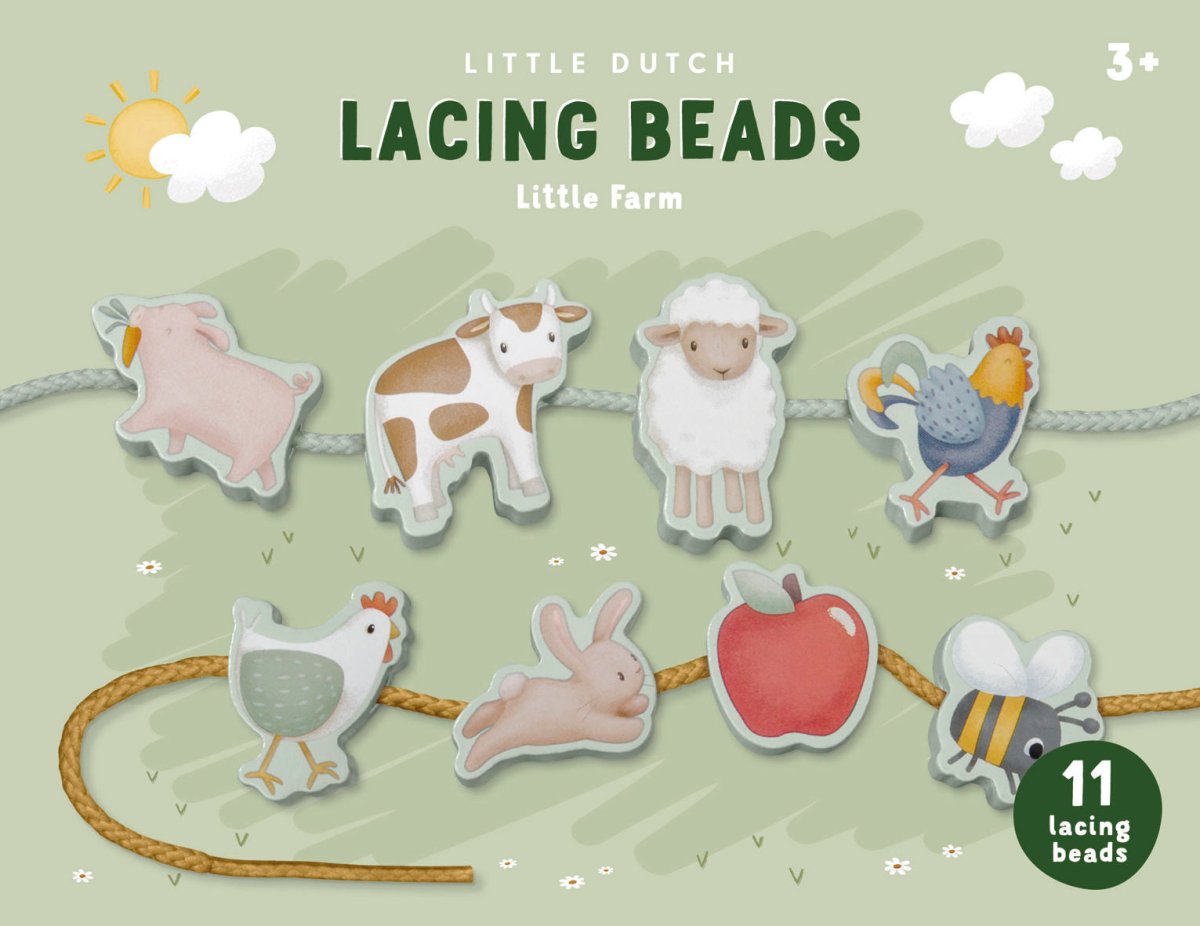 Ontdek de Little Dutch boerderij! Deze houten kralen, met zeer herkenbare afbeeldingen voor de kleintjes zoals een varken, koe, schaap, haan, tractor en meer uit de Little Farm serie, zijn extra groot en hebben een ruime uitsparing zodat kleine handjes ze makkelijk aan een veter kunnen rijgen. Er kunnen steeds weer nieuwe combinaties worden gemaakt. Inclusief 2 veters om aan te rijgen.