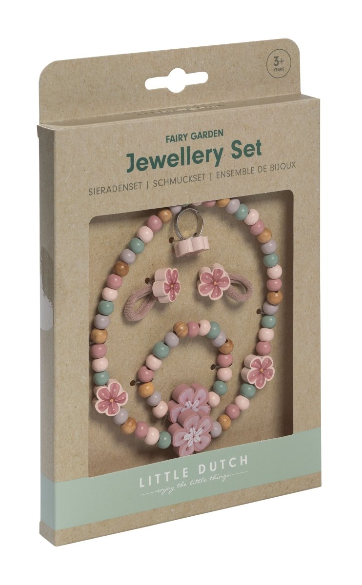 Een lieve en kleurrijke sieradenset van Little Dutch, perfect voor kleine meisjes die dol zijn op bloemen en accessoires. Ideaal als cadeau in de bijgeleverde geschenkverpakking. Inhoud van de set: 1 ketting 1 armband 2 haarclipjes met bloemenpatroon 1 extra accessoire (bloementhema) Kenmerken: Alle kralen en figuren zijn gemaakt van hout Verpakt in een mooie cadeauverpakking Stimuleert fantasie en rollenspel Geschikt voor kinderen vanaf 3 jaar