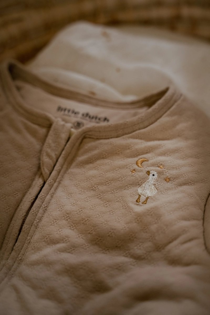 Houd je kleintje warm en knus deze winter met de Little Dutch winterslaapzak in de elegante Soft Beige kleur. Gemaakt van luxe jersey jacquard stof en 100% biologisch katoen, voelt hij heerlijk zacht aan. Het schattige borduursel met gansje op de borst zorgt voor een vleugje charme, terwijl de ronde onderkant en afritsbare mouwen praktisch en comfortabel zijn. Perfect voor koude nachten en schattige dromers. Er zit een flap over de rits om de gevoelige babyhuid te beschermen. De slaapzak is verkrijgbaar in 70 cm en 90 cm.