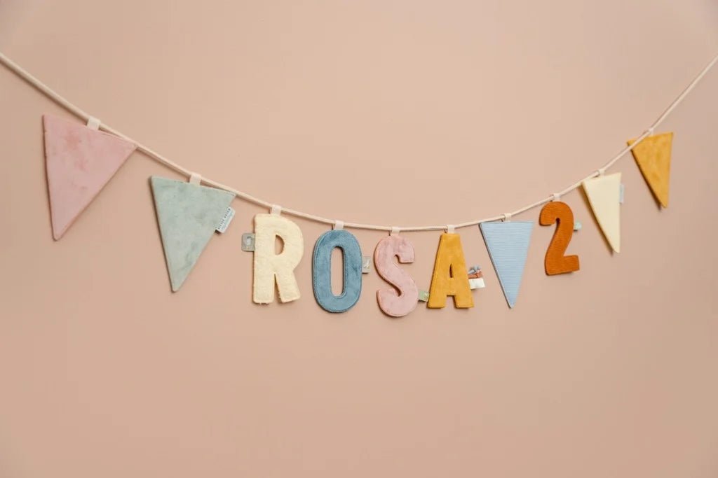 Letter F. Maak je eigen slinger voor je kindje of geef het cadeau. Het is gemaakt van zacht materiaal en is de perfecte decoratie voor de kinderkamer. Er zijn letters (A-Z), cijfers (0-10) en schattige ornamenten en vlaggetjes in bijpassende kleuren waarmee je je eigen slinger kunt maken. Vergeet niet om het bijpassende touw te bestellen waaraan je de ornamenten kunt hangen.