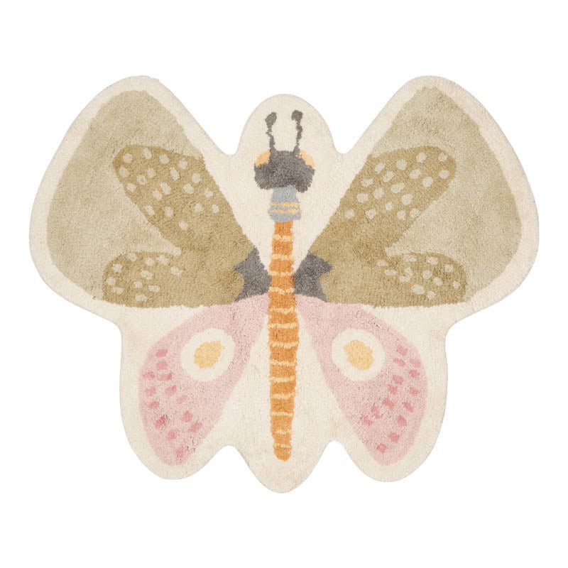 Zoet en lieflijk. Versier de kinderkamer met dit charmante vloerkleed in de vorm van een vlinder. Het is gemaakt van gerecycled katoen en zorgt voor een vleugje zachtheid in de baby- of kinderkamer. Het kleed is 110 cm x 94 cm en geeft het gevoel van een sierlijke bloemenweide. Kleine voetjes vinden het heerlijk, waarmee het een ideaal oppervlak is voor kinderen om op te kruipen, lopen en spelen.