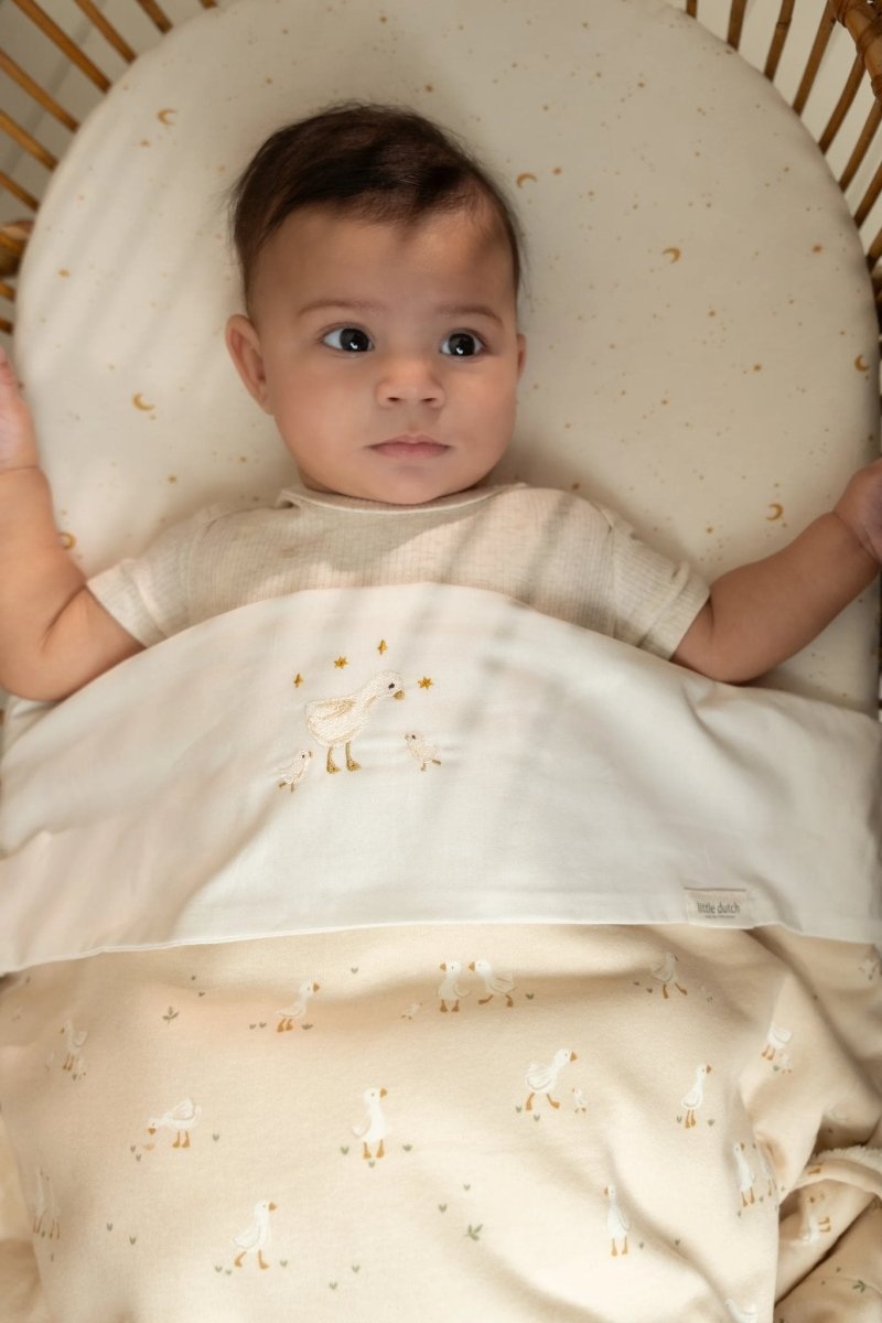 Een prachtig wiegdeken dat je kleintje heerlijk warm houdt. Met aan de ene kant zacht jersey en aan de andere kant het knusse fleece is dit deken veelzijdig: gebruik het als omslagdoek, sprei of zelfs als speelkleed. Dit exemplaar uit de Little Goose-collectie is versierd met schattige gansjes en combineert het beste van nostalgie met een frisse, moderne touch. Het is gemaakt van 100% biologisch katoen en heeft een royale TOG-waarde van 2.5, perfect voor koude nachten. En handig: je kunt het gewoon in de wasmachine wassen op 30 graden!