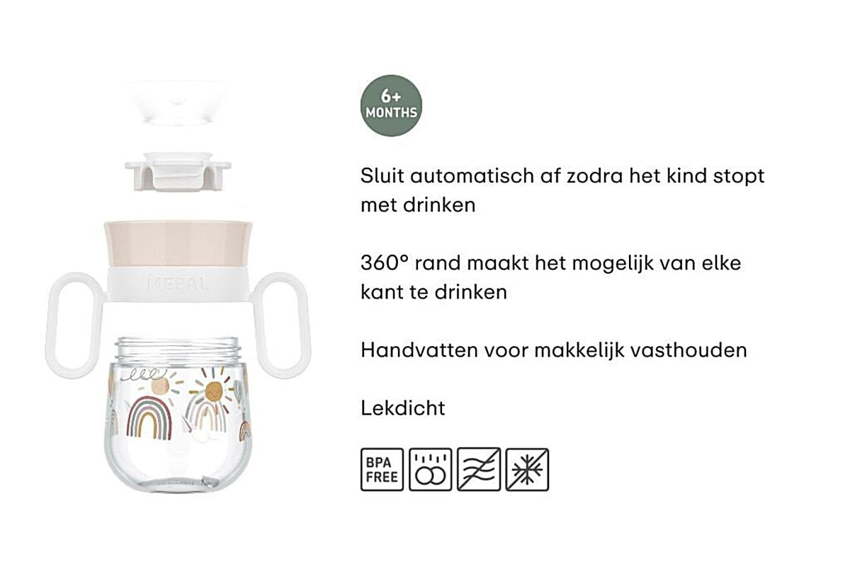 De Mepal Mio 360° drinkbeker met een inhoud van 200 ml, combineert functionaliteit met een mooi design. Dankzij het innovatieve ontwerp kan er vanuit elke hoek gedronken worden, zonder te morsen. Het lekdichte ventiel maakt de beker een betrouwbare keuze voor dagelijks gebruik, zowel thuis als onderweg. Gemaakt van duurzaam materiaal dat vaatwasserbestendig is.