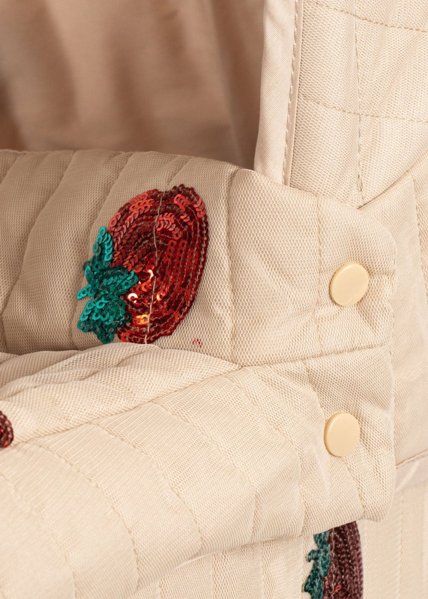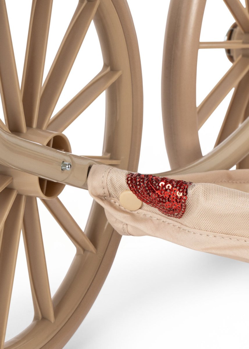 Deze poppenwagen in vintage stijl is een kleinere uitvoering die makkelijk te manoeuvreren is voor kleine poppenouders. Voorzien van vier grote wielen voor stabiliteit, gewatteerde stoffen bekleding en delicate schulpranden voor een charmante uitstraling. De wagen heeft een inklapbare zonnekap en een zacht gevoerde opbergmand onder de wagen.