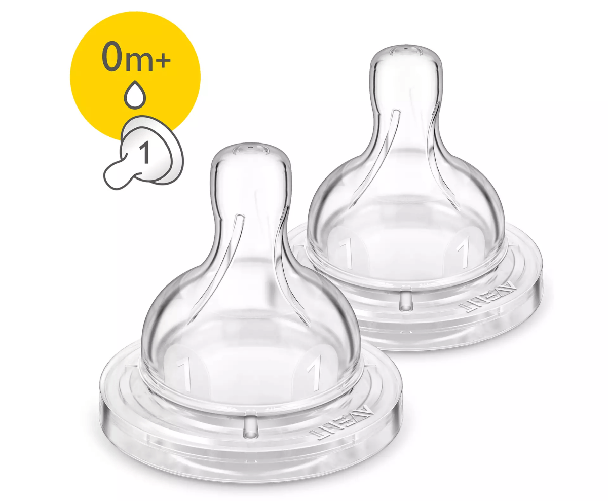 De Philips Avent Anti-colic-flessen groeien met je baby mee dankzij de spenen met verschillende toevoersnelheden. Leeftijdsindicaties zijn bij benadering omdat baby's zich verschillend ontwikkelen. Alle spenen zijn verkrijgbaar in verpakkingen van twee stuks: speen voor pasgeborenen, langzame toevoer, normale toevoer, snelle toevoer, variabele toevoer en een speen voor dikke voeding.