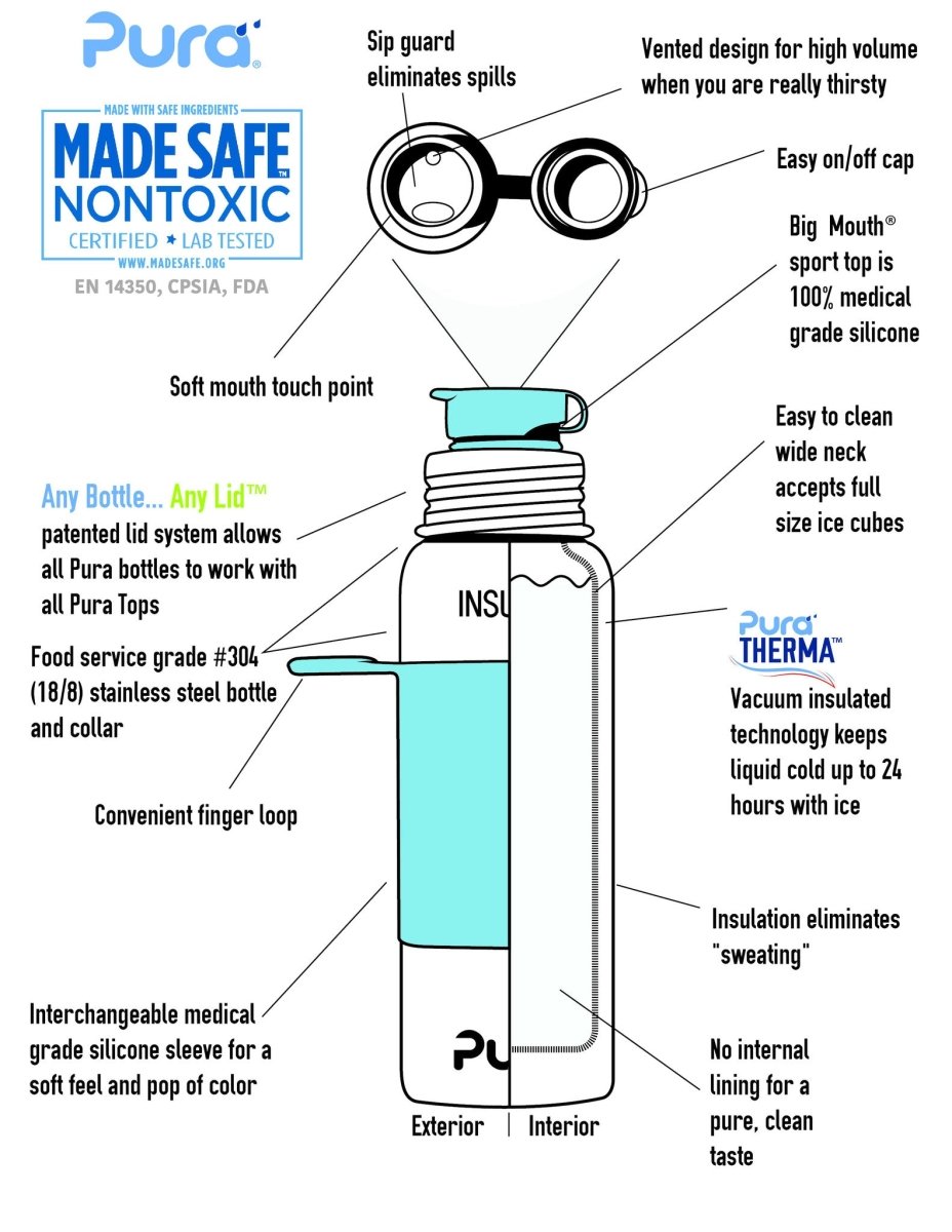 Deze award-winning RVS thermosfles is de enige 100% plastic-vrije thermos sportfles! De fles is plasticvrij en daarom veilig, milieuvriendelijk en bovenal praktisch. De top is verwisselbaar waardoor de fles op verschillende manieren kan worden gebruikt. Voor volwassenen is de sportdop bijvoorbeeld te vervangen door een sportrietje. Maar de fles is ook te gebruiken voor kinderen door de top te vervangen door speen, tuit of kinderrietje. De thermosfles houdt de inhoud tot 6 uur lang warm of koud. Pura is als enige ter wereld NONToxic gecertificeerd door MadeSafe.org. Waarom Pura: VEILIG: De enige 100% plasticvrije fles... dus geen veiligheidsrisico; Gemaakt van hoogwaardige kwaliteit RVS (#304 of 18/9 kwaliteit); Silicone van anti-bacteriële medische kwaliteit; MadeSafe™ gecertificeerd; Verleng de levensduur van Pura flessen door te wisselen van dop. Hierdoor gaan de flessen levenslang mee; Vrij van BPA, PVC, Phthalaten en lood; Fles wordt geleverd inclusief sportsleeve en sportdop. Pura flessen kunnen worden gebruikt worden om vloeistof in te vriezen, gebruik hiervoor de siliconen afsluitdisk, deze is apart verkrijgbaar. Doe de fles niet te vol, de vloeistof zet uit als ze bevriest (niet meer dan 500 ml in de 650 ml fles). Let op: de sportdop niet gebruiken in combinatie met hete vloeistoffen, deze is hiervoor niet geschikt! Reiniging en sterilisatie De Pura thermos flessen zijn niet vaatwasmachinebestendig door de isolatiewand. Je kan deze met de hand wassen met een milde zeep en een fles- en speenborstel. Vermijd het gebruik van harde schoonmaakmiddelen want deze kunnen de fles aantasten. De silicone onderdelen van de Pura flessen zijn wel vaatwasmachinebestendig.