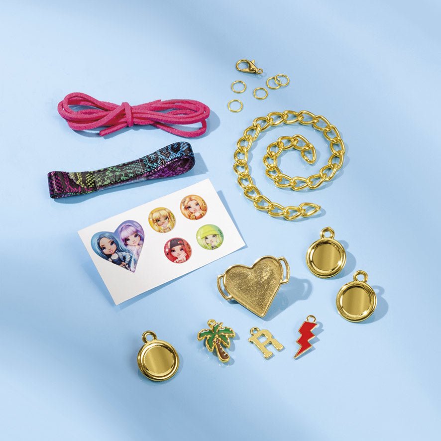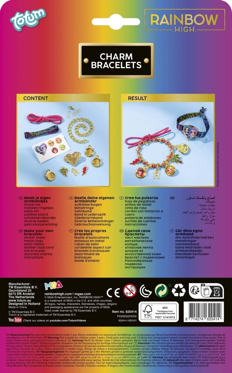 Maak je eigen bedelarmbanden met deze leuke set van Totum - Rainbow High! De set bevat twee armbandjes en gouden bedeltjes. Maak zelf een armband van luxe satijnen lint met hartbedel en stickers, en versier een goudkleurige schakelarmband met suedine koord met metale palmboom- en bliksem-, R en 2D stickerbedels. Zo bepaal jij zelf hoe jouw mooie armbanden eruit komen te zien!
