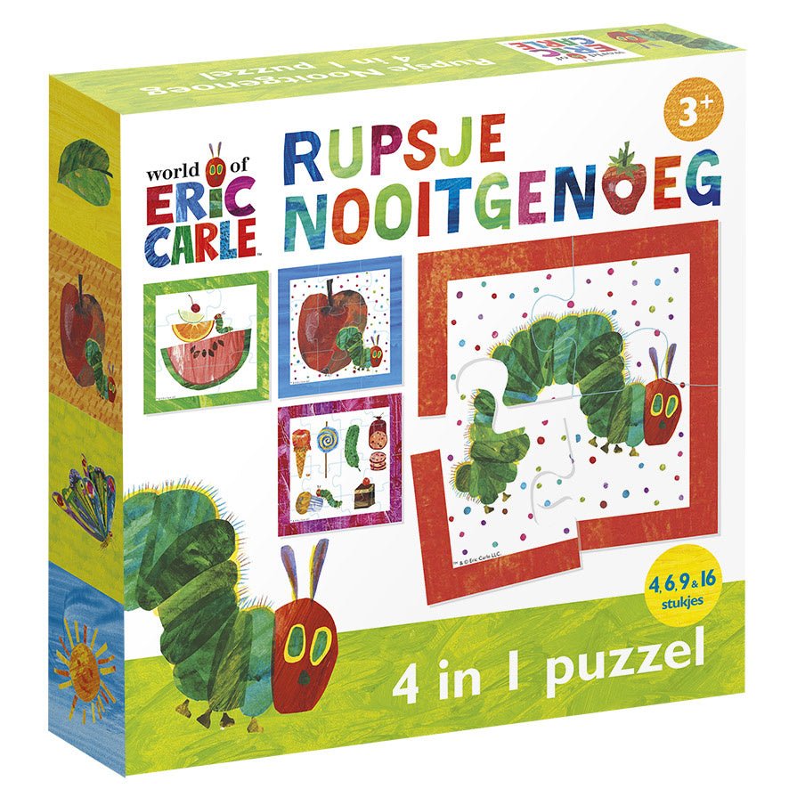 Deze set bestaat uit 4 puzzels met bontgekleurde afbeeldingen uit het boek Rupsje Nooitgenoeg van Eric Carle. Hierin gaat het rupsje op zoek naar heerlijke hapjes die je ook terug ziet op de puzzels. De jongste puzzelaars beginnen met een puzzel van 4 stukken en wie toe is aan de volgende uitdaging kan een puzzel van 6, 9 of 16 stukken leggen.