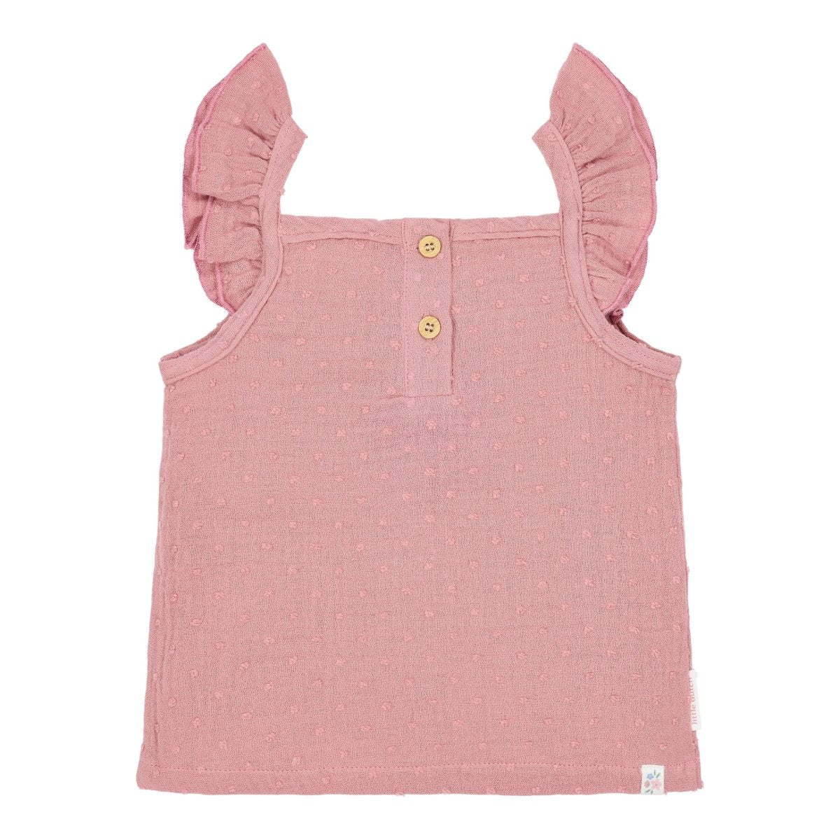 Licht, luchtig en vol lieve details. Dit singlet in Pink Blush is gemaakt van een fijne geweven stof met een subtiel stipje dat in de stof is verweven. De ruches op de schouders geven het singlet een speels en zomers karakter, perfect voor warme dagen.