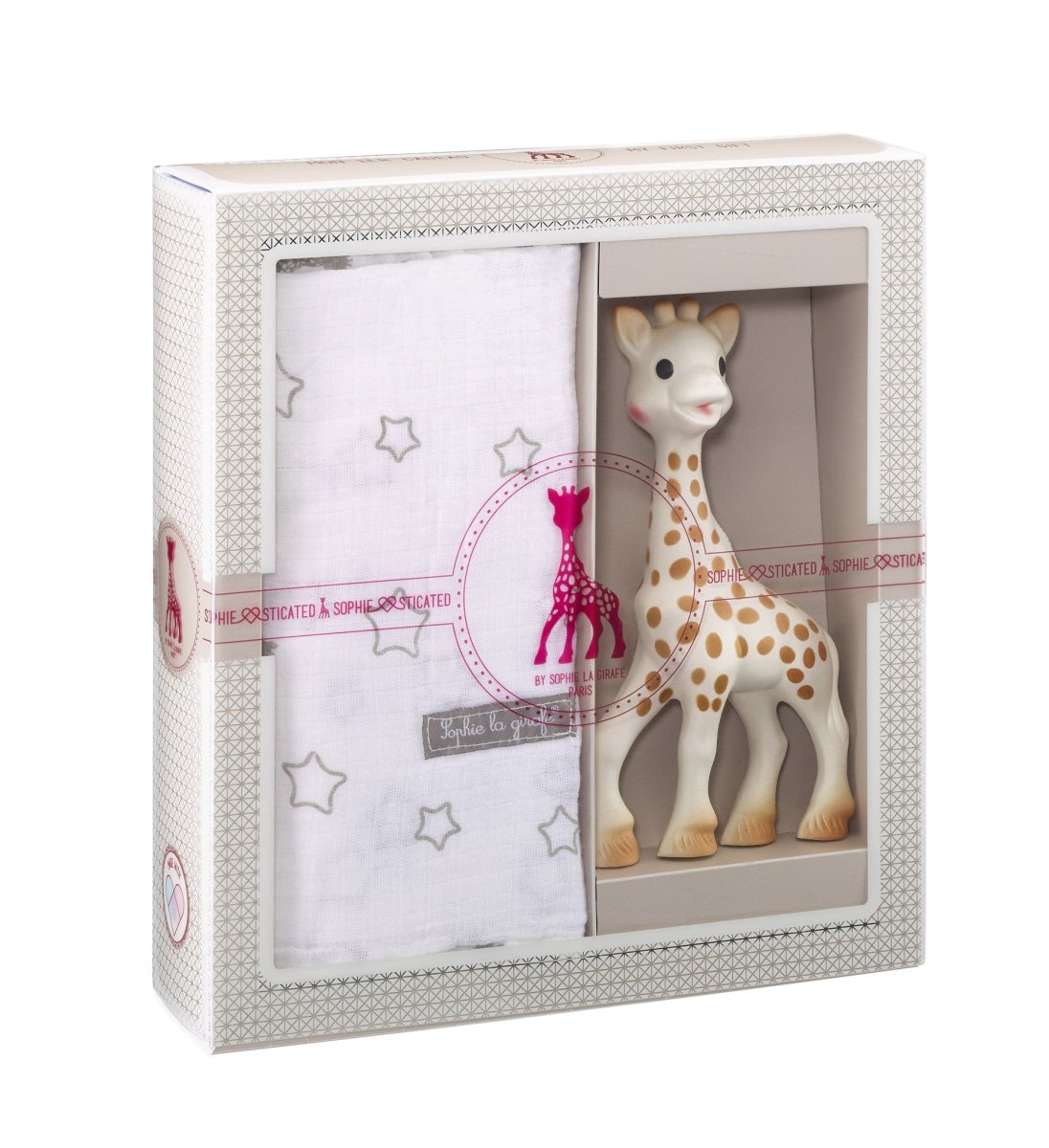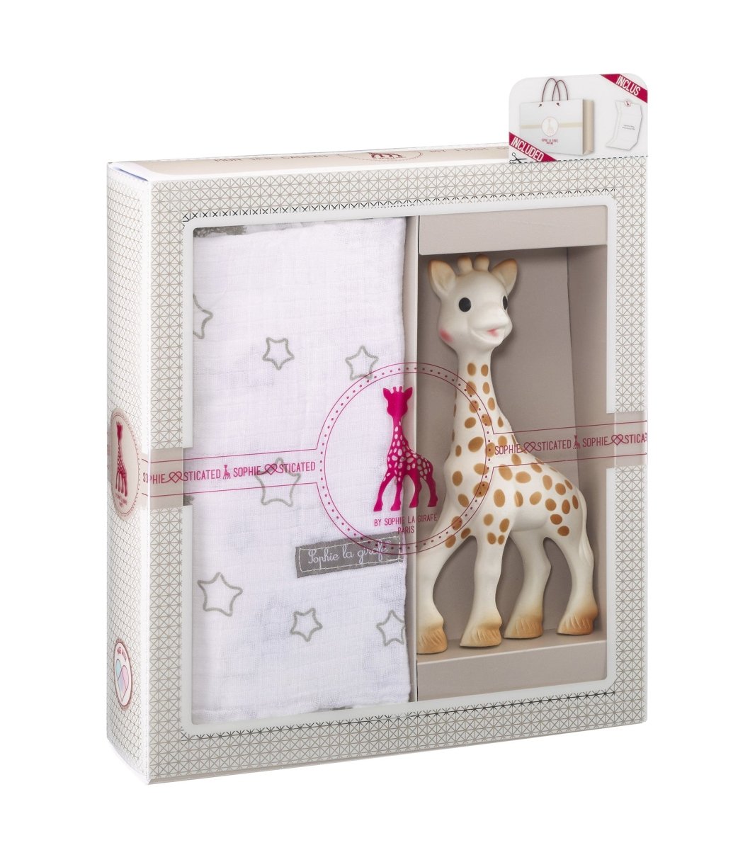 Mooie cadeauset uit de Sophiesticated serie, de ideale collectie om de baby welkom te heten. Deze cadeaus bieden essentiële producten in een mooie en verfijnde cadeaudoos. Ieder van deze cadeausets bevat ook een Sophie de giraf wenskaart en een cadeautasje met zijden linten, ideaal voor het aanbieden van het mooiste geschenk ter gelegenheid van een onvergetelijke gebeurtenis. Deze Sophiesticated cadeauset bevat: Sophie de giraf; Sophie de giraf grote zachte hydrofiele swaddle (120x120cm); Sophie de giraf wenskaart; Sophie de giraf cadeautasje met zijden linten. Grootte: 24 x 27 x 6 cm.