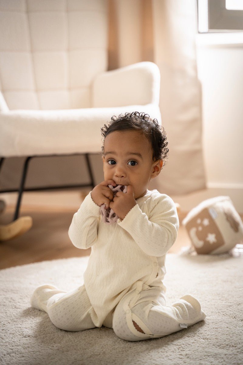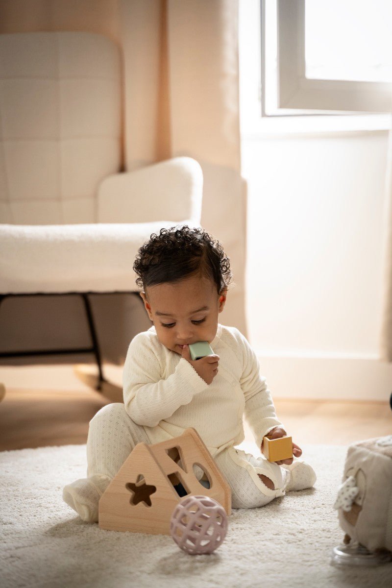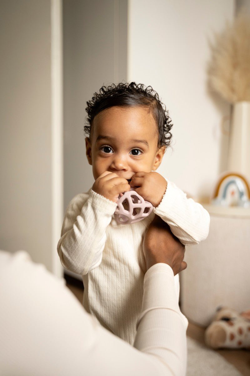 De speelballen zijn daarnaast ook perfect als bijtspeelgoed. Het zachte siliconenmateriaal biedt verlichting bij het doorkomen van tandjes en kalmeert gevoelig tandvlees. Bovendien passen de tijdloze kleuren en het moderne design prachtig bij iedere babykamer of speelruimte.