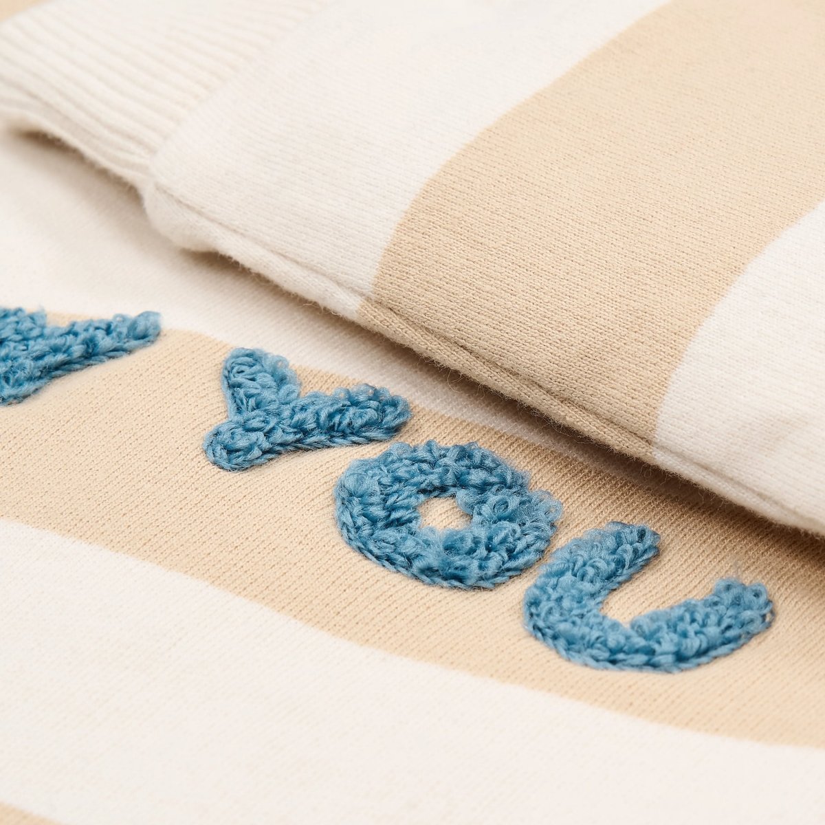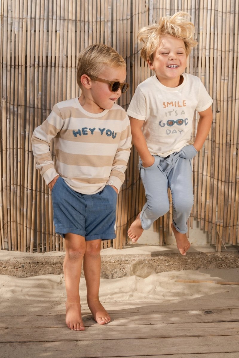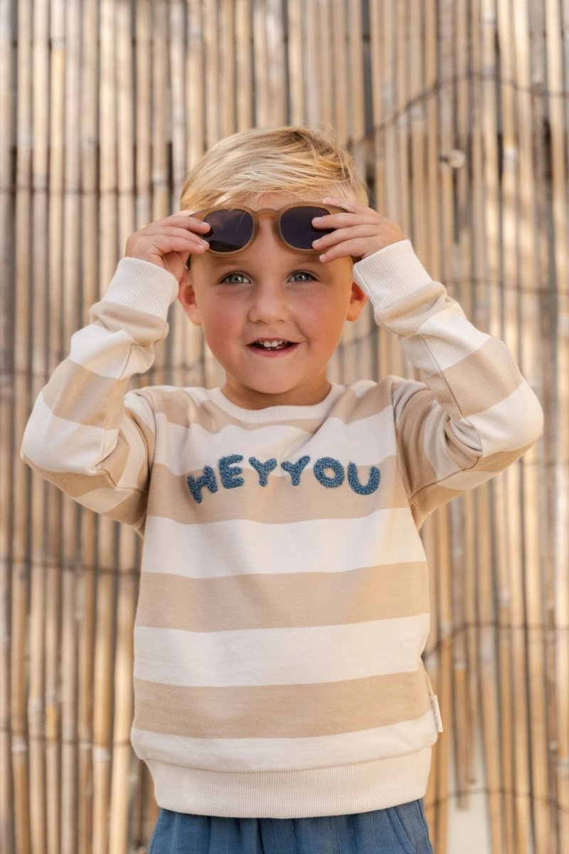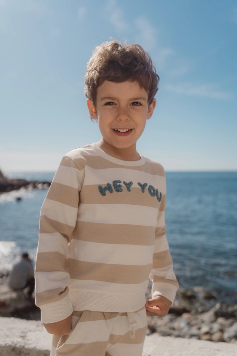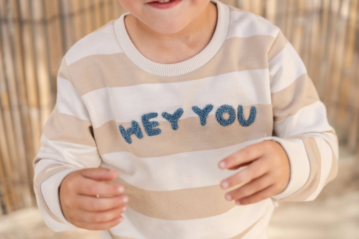 Zacht, stoer en altijd klaar om te knuffelen: deze sweater in biscuitkleur met brede strepen is perfect voor frisse dagen. De lichte sweatkwaliteit voelt heerlijk zacht aan en houdt je kleintje comfortabel warm. Op de borst staan geborduurde letters met de tekst Hey You, een vrolijke knipoog voor elke dag. De contrasterende boorden geven een speels accent. Gemaakt van 100% biologisch katoen en Oeko-Tex gecertificeerd, is deze trui zacht voor de huid en ideaal om in te bewegen en te spelen.