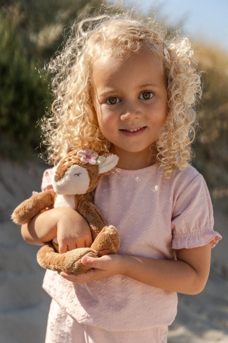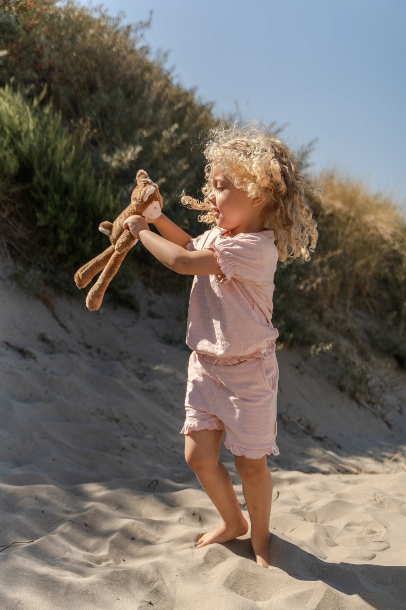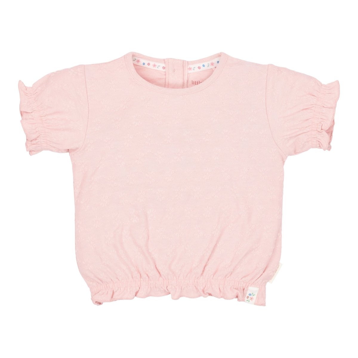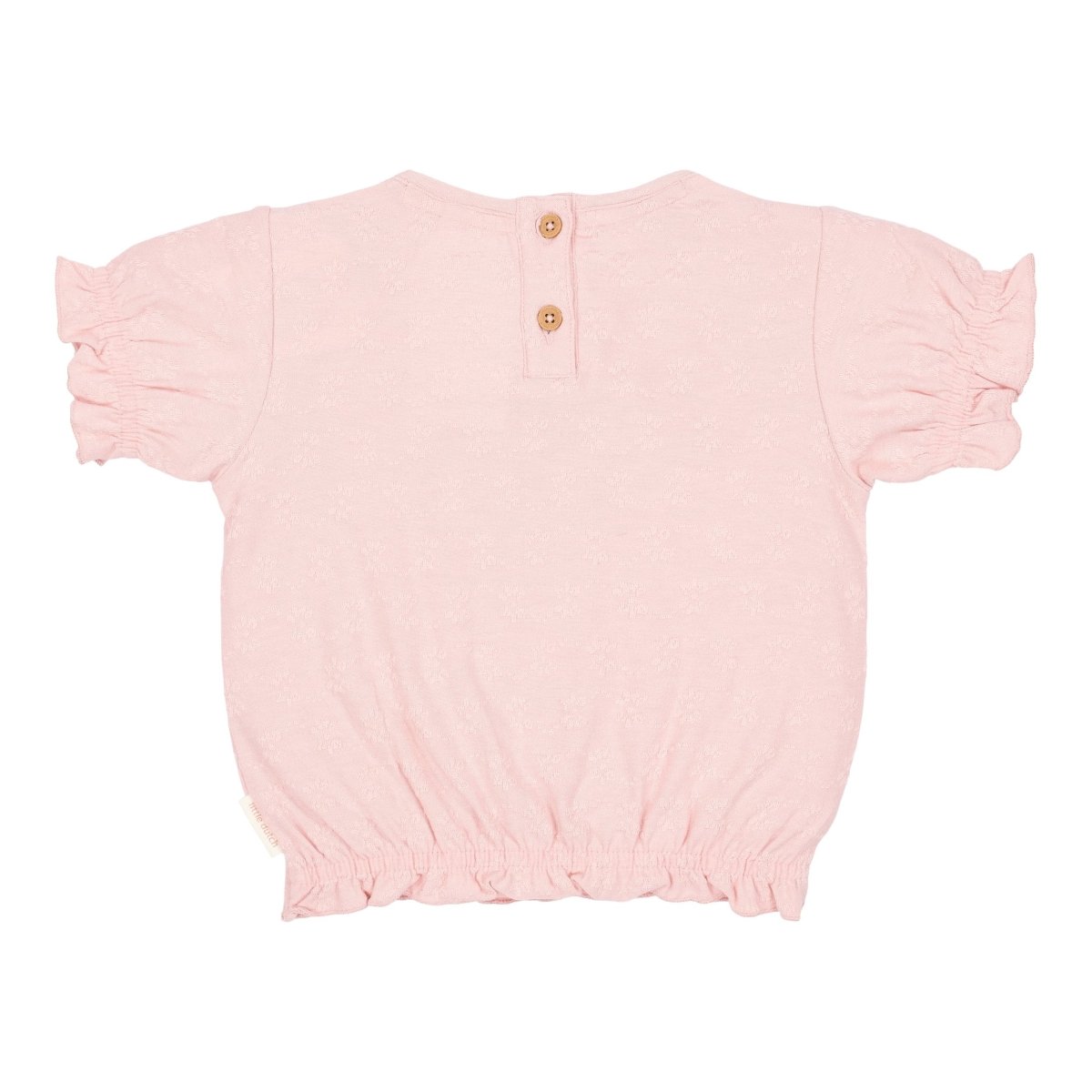Zacht, comfortabel en helemaal klaar voor zomerse avonturen. Dit T-shirt in Fairy Pink is gemaakt van een elastische stof met een subtiel bloemenreliëf, perfect voor kleintjes die graag bewegen en ontdekken. De mouwen hebben een elastische opening met speelse ruches en ook de onderkant is afgewerkt met een zachte ruche voor een extra lief detail.