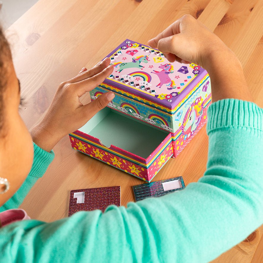 Versier je eigen sieradenkistje. Dit kistje heeft een vrolijk design in eenhoorn thema. Wat nog leuker is aan deze sierandenkist: je kunt zelf bepalen hoe hij eruit komt te zien! Beplak het kistje met de zelfklevende metallic foam blokjes en zelfklevende strassteentjes. Nu heb je al je sieraden bij elkaar in een mooie zelfgemaakte sieraden kist.